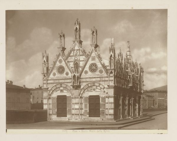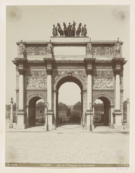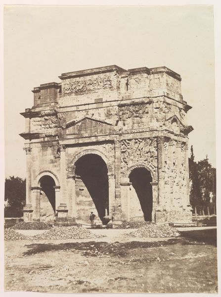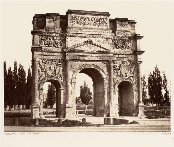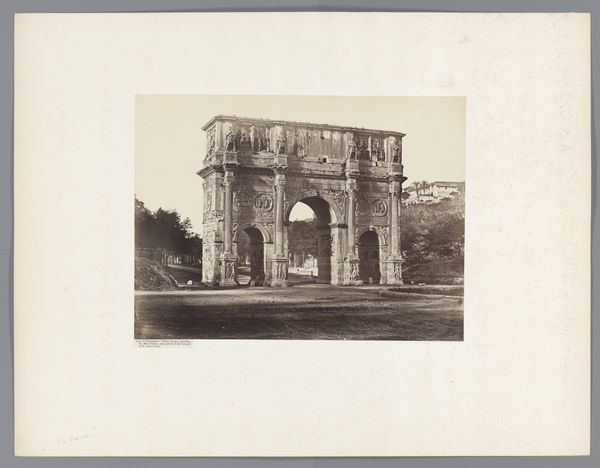 Curator: This is a photograph taken by the Bisson Frères, around the 1850s, depicting the Arch of Constantine in Rome. The image is a silver print. Editor: It has a rather majestic, yet worn, feeling. The arch fills the frame, its surface teeming with detail, and it's interesting to note the rather substantial timber propping system attached to it at the time the photograph was taken. Curator: Indeed. The presence of the wooden support draws our attention to the material and structural reality of this ancient monument. The photograph highlights the passage of time and ongoing need for care and intervention when dealing with art and architecture, while revealing how the labour is necessary to preserve it. Editor: And its significance to the urban fabric and identity of Rome, of course. This photograph speaks volumes about the ongoing relationship between the ancient world and modern Europe, showing the ways that historical monuments are kept in the public eye. The arch itself served a specific political purpose. Commemorating Constantine’s victory, it became a symbol of power and continuity for later rulers and regimes. Its survival speaks volumes. Curator: That's right, its continued existence is a testament to material choices and labor practices. Using the silver printing process provided a degree of clarity that highlighted detail of the sculpted reliefs. These reliefs weren't merely decorative; they served to reinforce Constantine's image. Editor: I agree, it’s not merely an artifact from the past, but also plays an active role in the present, shaped by continuous interpretation and public investment. This image by the Bisson Frères underlines how that plays out through social engagement. Curator: It certainly underscores the point. The interplay between materiality, labour, and historical representation is fascinating, making one consider what elements of modern architecture and practices future generations might choose to value. Editor: Precisely! And how these choices will influence the narratives they create about our own time. It's images like this one that invite deeper thought and analysis.