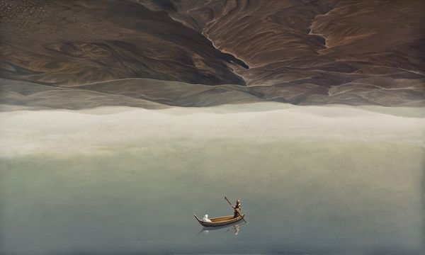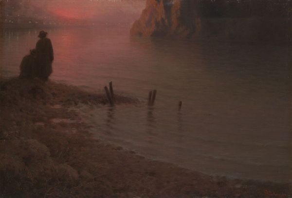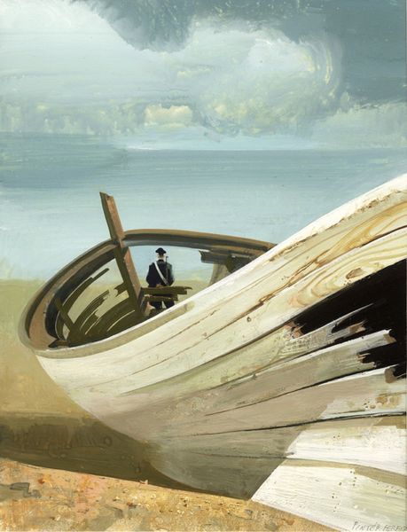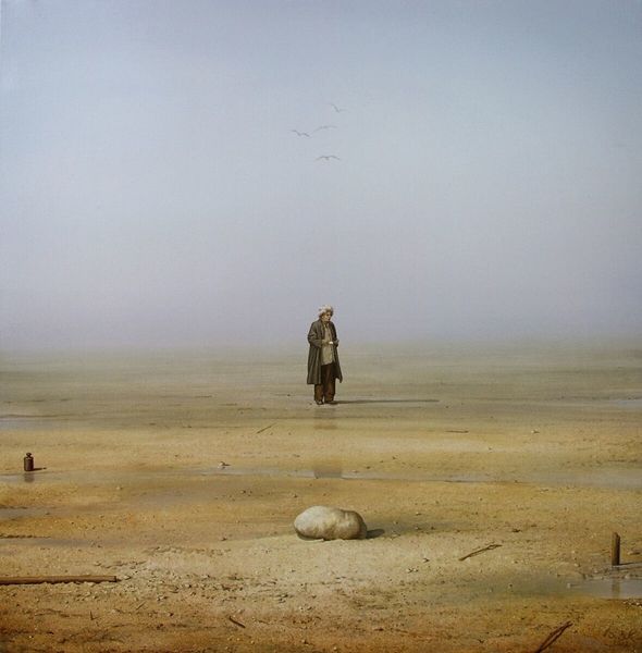 Curator: Looking at Siegfried Zademack's 2013 oil painting, "Hilfe von oben," I am immediately struck by a pervasive sense of stillness and melancholy. Editor: It certainly evokes a mood. What grabs me is the depiction of labor here. Consider the weight and rust of that metal bucket poised above the well. It speaks volumes about the sheer physicality and effort involved in a fundamental task. Curator: The well itself, positioned prominently in the foreground, becomes almost sculptural in its presence. It really directs our view through a history of how communities have worked together in the rural landscape. I am struck by the ways in which water has been constructed, made, and then mythologized as both a lifeline, but also an object to control and commodify. Editor: Exactly! And notice how Zademack uses the materiality of the oil paint itself to create a hazy, almost dreamlike quality, softening the edges of realism while suggesting a brutal sense of labor. The subdued palette speaks to the environment—how the act of acquiring water has been affected, altered, or exploited from extraction and transport? Curator: The solitary figure in the distance reinforces this, almost like a mirage on the horizon, blurred and distant from the practical well right beside us. It raises questions about resilience. What forces were at play? And where can it be seen within art and history, both broadly and particularly in times of scarcity? Editor: Absolutely. Thinking about contemporary discussions around sustainable development, water rights, and environmental justice— the artist's material choices like his rendering of rusted iron is really foregrounding a specific understanding of consumption. Even a straightforward act like pulling water becomes a poignant visual metaphor, doesn't it? Curator: It really does, highlighting how these kinds of isolated works in the landscape connect not only to local histories but broader discourses of social change and environmental action. Editor: Agreed. Zademack invites us to consider these elements—material and cultural—within a socio-political frame. It is a great example of how art functions. Curator: Indeed, a potent combination for encouraging engagement.