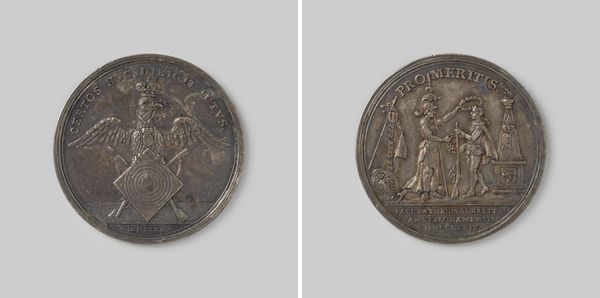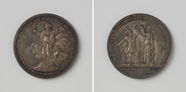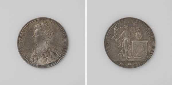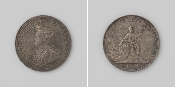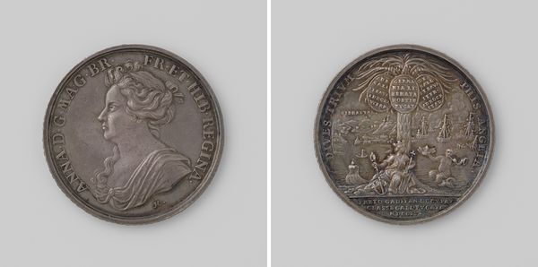 Editor: This is "Gibraltar ingenomen en de Franse vloot verslagen bij Malaga," created in 1704 by John Croker. It appears to be a metal relief sculpture, maybe a coin or a medallion? The imagery is striking, quite baroque I think, very celebratory and grand. What do you see in this piece? Curator: Indeed, it's a fascinating object that tells us much about the political and social climate of its time. Medals like this served as powerful propaganda tools. They were commissioned to commemorate significant events and shape public opinion. Editor: So it's not just art for art's sake? Curator: Rarely! Look at the imagery closely. One side shows a portrait of Queen Anne, crucial to legitimizing power. The other side depicts Britannia, goddess and embodiment of Britain, and Neptune celebrating the naval victory. How does that juxtaposition strike you? Editor: It feels… intentional, of course. It’s presenting the Queen as the driving force behind this victory, almost deifying her by association with these powerful figures. Curator: Precisely. And consider the material - metal. It’s durable, lasting. It signifies permanence, power, wealth. It allows for mass production, spreading the message widely. These medals weren't simply documenting history; they were actively constructing it. Editor: So it's like a 18th-century press release, but in metal. Curator: Exactly! Thinking about the intended audience also gives more insights, not just nobility, it trickled down to people who supported their agenda. This work isn’t about aesthetics alone; it’s a meticulously crafted statement of political might. Editor: That's really fascinating. It makes me think differently about all art made during times of conflict or change. Curator: Understanding the political purpose shapes how we see its value. Each detail then speaks to the broader power structure of the time. Editor: Definitely. It’s given me a lot to think about! Thank you for pointing out the historical context that's embedded in this work.