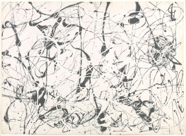 Here we have an untitled drawing by Atsuko Tanaka. A mass of lines dominates the composition, punctuated by circular forms. The drawing suggests a network, where lines act as conduits connecting the circles. But what does this network represent? Tanaka's work often explored themes of connectivity and systems, influenced by her earlier work with electrical dress. You see how the lines and circles create a sense of dynamism, as if energy is coursing through the network. The repetitive use of these elements almost renders the drawing as a kind of map, perhaps charting the flow of information. Consider the implications of this system: does it liberate or confine? Tanaka's art often prompts us to question the relationship between the individual and the larger structures of society. The drawing, ultimately, is an open-ended inquiry into the nature of modern life and the systems that shape our experiences.