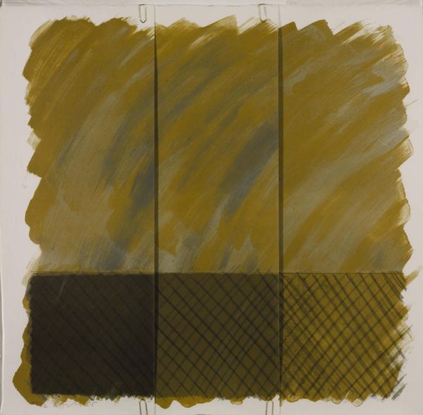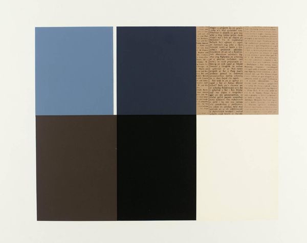 Curator: Alan Green's "White on Brown" divides our attention into four distinct quadrants. The top left is a void of deepest umber, an anchor that throws the other, lighter squares into stark relief. What do you make of it? Editor: I immediately think of minimalist grids—Agnes Martin comes to mind—but there’s a handmade quality here, an almost tactile roughness that counters the mechanical precision. The textured squares feel almost like woven textiles. Curator: Exactly. Green's process involved layering and scraping, creating a surface that feels both planned and accidental. He was interested in the subtle shifts in tone, how colors interact and how the viewer perceives those relationships. Editor: Knowing that gives it a new dimension. I see the interplay of negative space—the dark quadrant—with the woven textures as a commentary on the limitations of representation itself, almost like a deconstruction of form. Curator: I think it's more intuitive than that. More a meditation on color and surface. The brown and white, the light and dark, feel balanced, like a quiet conversation. Editor: Perhaps. But even quiet conversations can carry subversive weight. Ultimately, I see Green's work as an invitation to interrogate the very nature of seeing. Curator: And for me, it’s a reminder that beauty can be found in the simplest of forms.