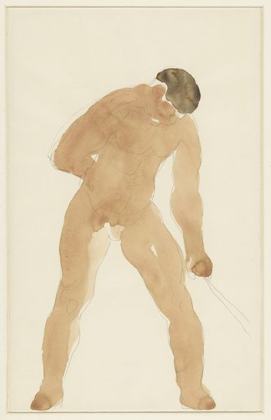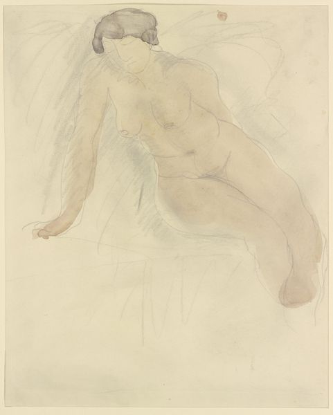 Curator: Oh, there’s such vulnerability in this posture. It’s almost painful to watch, like a primal scream translated into a contorted pose. Editor: Indeed, it’s a rather visceral sketch. Here we have Auguste Rodin’s “Woman Dancing with Her Head Thrown Back, rear view," dating from around 1890 to 1917. This drawing, rendered in watercolor, resides here at the Städel Museum. Curator: Watercolor… of course. It makes it feel ephemeral, transient. Look at those ghostly outlines barely defining her form. It feels like capturing a moment that’s already vanished. Was he trying to capture the essence of fleeting passion, perhaps? Editor: I think that's part of it. Rodin was, of course, obsessed with movement and capturing raw emotion. But it's important to remember the social context, too. The late 19th century saw increased artistic exploration of female bodies outside traditional academic poses. Curator: You're right. It breaks from classical depictions, doesn't it? This isn't a poised goddess, but a woman lost in…something. I wonder what music she’s hearing. What demons she’s battling. It seems a struggle between abandon and captivity to me, maybe internal demons… Editor: That tension is palpable. Rodin challenged the academic system by making preparatory drawings central to his practice, rather than studies for larger sculptures. So in that sense, he really was making a statement about the power and the autonomy of the artistic line itself. And of the female figure. Curator: Interesting! So it wasn’t just about the subject matter, but a whole ethos of defiance, of breaking free from constraint. Almost like the woman is doing. It resonates, doesn’t it, with anyone who’s ever felt the urge to cast off expectations? Editor: Exactly. Rodin pushed against artistic boundaries and also societal ones in his art. "Woman Dancing" shows this clearly. These nudes, like the artist’s broader exploration of the figure, were deeply engaged with pushing boundaries, engaging in the conversations, and inevitably, shaping public views of art and the role of the female figure. Curator: It definitely lingers with you after you leave it, which speaks to its power. The incompleteness becomes part of the emotional expression. Editor: An apt conclusion. Rodin's study holds lessons beyond the technique of watercolor – he embodies a larger discourse concerning autonomy, public view, and artistic purpose.