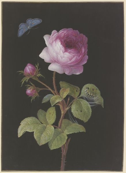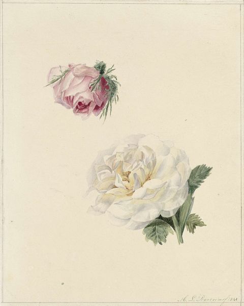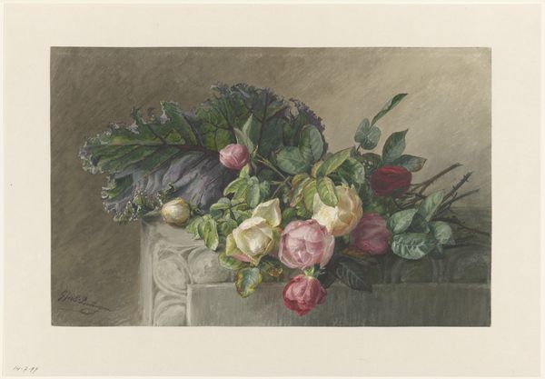 Willem de Famars Testas painted "Boeket rozen en pelargonium" using watercolor. It is interesting to consider Testas’s heritage when viewing this bouquet. He was of Dutch and Indonesian descent, born in the Dutch East Indies now Indonesia, a colony which was a site of great cultural exchange. He returned to the Netherlands as a young man. He was able to navigate various cultural identities. Although this piece appears to be a traditional still life, it suggests cross-cultural influences. The arrangement of roses and pelargoniums is both delicate and deliberate, with the flowers seemingly spilling out from a paper cone. The choice of flowers carries symbolic weight. Roses are often associated with love and beauty, while pelargoniums can symbolize comfort and gentility. These floral choices create a sense of intimacy, inviting viewers to contemplate the quiet beauty of everyday life. This image invites us to consider how artists use seemingly simple subjects to explore complex identities.