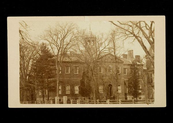 Editor: This is "Hollis Hall, Harvard University" by George Kendall Warren. The sepia tones and the bare trees give it such a stark, wintry feel. What historical context should we consider when viewing this image? Curator: Consider who had access to higher education when this photograph was taken. How did institutions like Harvard shape social hierarchies and power structures? Editor: So, it’s more than just a picture of a building? Curator: Exactly. Think about who was excluded, whose stories weren't being told within those walls. It challenges us to consider the ongoing struggle for equitable access to education. Editor: That gives me a lot to think about. Curator: Me too. Hopefully, our listeners can reflect on this image critically, too.