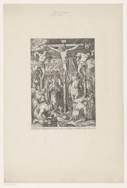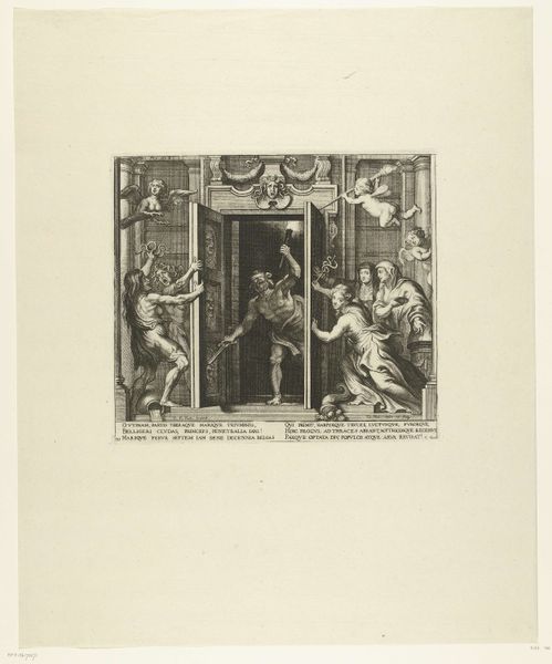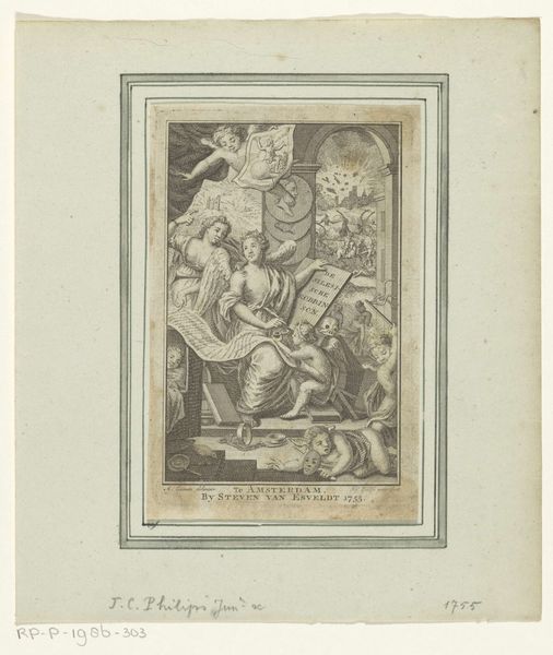 Curator: This engraving before us, created by Theodor Matham in 1628, is titled "Haarlemse Stedenmaagd met stadsgezicht" and held at the Rijksmuseum. Editor: My initial impression is of a contained yet elaborate world—intricate details bounded by a rather rigid structure. It feels almost like peering into a miniature stage setting. Curator: Precisely. The composition employs classical elements: notice the central figure, the Haarlem city maiden, framed by symbolic motifs. Angels hover above, each holding shields. Below, the scene culminates in an inscribed tablet, adding textual weight to the imagery. Consider the way Matham uses light and shadow, the balance within this self-contained plane, as they speak volumes to the allegorical richness of the scene. Editor: Right, and let's also note that the texture, despite being a print, feels remarkably tactile. I'm struck by the deliberate, crafted nature of each line and mark. We have to remember this wasn’t mass-produced using automated techniques. Human labour, skill, and close material engagement with the copper plate, and the implications for trade in printed images. The choice of engraving speaks to a desire for replicability, connecting this image to a larger economic network. How were prints traded and sold and displayed at this time? Curator: An excellent point. This replicability served the spread of humanist ideals but within structured hierarchies and classical artistic modes of expression, it’s almost architectural with allegorical intent at its heart. Each part adheres to a logical hierarchy of symbolism within a rigid, frame. The composition and thematic layering all function like a precisely arranged building, or temple, each section informing the other, but on paper instead of stone. Editor: Absolutely! This interplay reveals how materials and modes intersect: an embrace of commerce hand in hand with art’s traditional aim for legacy and endurance. This piece represents the beginning of image consumption. In order to study its full effect one would really want to track the use, aging and journey from creation to when it enters places like The Rijksmuseum. How have these engravings been used by diverse hands across the decades? Curator: I find that incredibly valuable to explore; that history is ingrained in every curve and contour and is as important to decoding Matham’s work as are the technical components of its creation. Editor: Agreed, recognizing the value inherent in these art objects through production and material allows a new reading into art of that age.