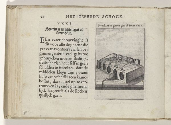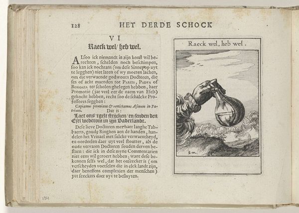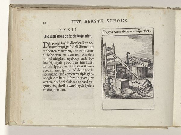 This engraving, “L Galathea wacht u wel”, was created by Roemer Visscher around the turn of the 17th century. It's found within the pages of a book, pairing an image with a block of text. The artwork illustrates a fable, the story of a copper pot attempting to persuade an earthenware pot to keep company, so that they would both be better protected. The earthen pot refuses, stating that it would rather ‘flee into pieces’ than cause any harm to the copper pot. Through this tale, Visscher appears to comment on the social dynamics of his time. "Galathea wacht u wel" is taken from a love song written by the eminent Dutch poet Pieter Corneliszoon Hooft. There is an emotional core to this piece, it explores themes of protection, class, and the acknowledgement of one's place within society. The humbleness of the earthenware pot speaks to the way society was structured. It maintains traditional social representations while prompting a deeper reflection on personal worth.