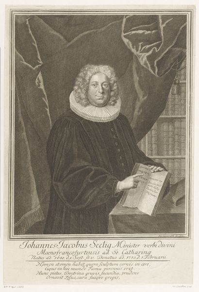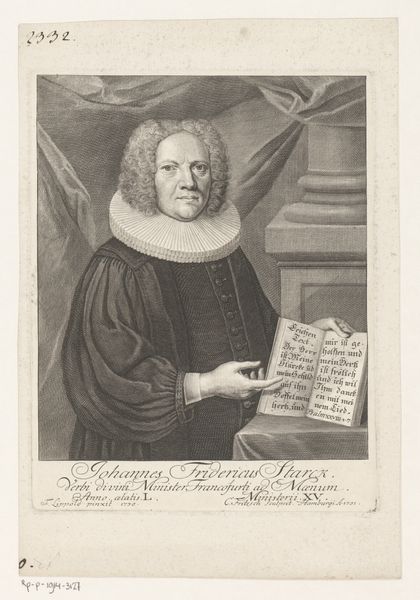 Editor: This is a print, an engraving, of Johann Friedrich Starck by Valentin Daniel Preissler, made in 1745. I find the ruffled collar particularly striking; it draws my eye immediately. How do you interpret the significance of such a pronounced detail? Curator: The collar, yes, it is not merely decorative. Think of the ruff as a kind of halo, an assertion of status but also of adherence to a specific order, a codified system of belief. What does the open book signify to you? Editor: I suppose the open book connects to his position as a preacher... a symbol of knowledge and faith? Curator: Precisely. Books in portraits are almost never arbitrary. They signify erudition, piety, wisdom. The text, although difficult to read clearly, emphasizes the importance of scripture to Starck's identity. Notice, too, how his hand gently rests upon the pages. Do you see how this gesture conveys not only learning, but a reverence for the written word? Editor: Yes, I do. So the engraving, by highlighting these symbols, creates a very deliberate representation. It speaks to how Starck wanted to be remembered? Curator: More than just remembered, perhaps – perceived. He is presented here as an authority, both earthly and divine. The drape in the background suggests affluence and adds grandeur. It is an assertion of power achieved not through military strength but intellectual and spiritual means. The visual vocabulary alludes to lasting virtues and continuity. Editor: I see it now – the enduring quality. Focusing on the symbolism really helps unpack the portrait’s message. Thank you. Curator: It is a fascinating thing, isn't it, how artists and patrons use visual symbols to shape our understanding of individuals and their place in the world?