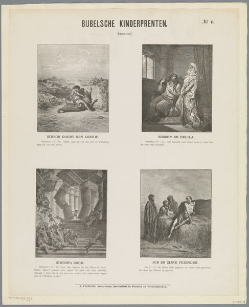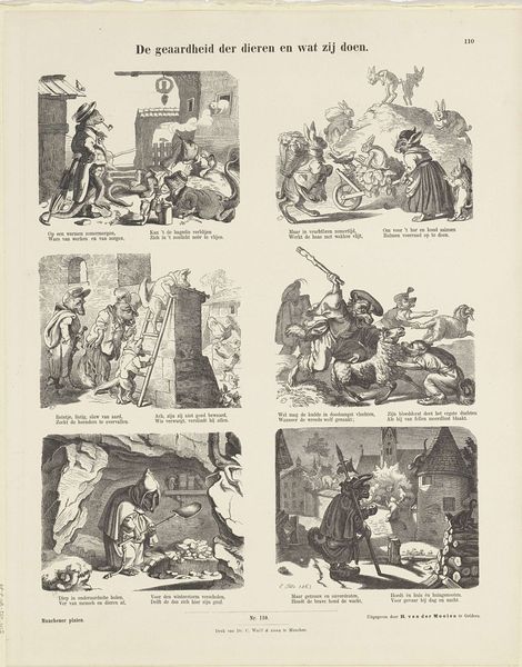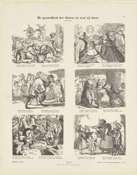 Editor: Here we have "Het bultenaartje," or "The Hunchback Girl," an engraving that dates approximately from 1843 to 1920, credited to E. Ille. It is a busy image with many vignettes depicting different scenes. It makes me think of sequential art, or a very early comic strip. How would you interpret a piece like this? Curator: Given the period and the form – a printed engraving consisting of several vignettes – I’d say this work speaks volumes about the evolving role of visual storytelling in mass culture. Think about how printmaking democratized art, taking it out of elite galleries and into homes. How does this engraving engage with themes of genre-painting and narrative-art? What story do you believe it is trying to tell? Editor: From the scenes shown, a woman helping a hunchbacked figure in several different contexts. Almost like acts of kindness in exchange for help or goodwill. The images tell a sequential story of a woman assisting the hunchback. Curator: Exactly. But look closer. Are there patterns? Each image is meticulously crafted, no? They showcase domestic labor, charity, and perhaps even societal expectations placed on women. Do these images offer a critical lens to that? Editor: Well, the scenes all focus on the woman's actions in various spaces: outdoors, inside a home, in a workshop...almost like her entire life revolves around these duties. If this work was made between 1843 and 1920, were gender roles a common artistic theme at that time? Curator: Certainly, and it’s essential to examine whose gaze and which social institutions frame this narrative. Understanding the history behind print culture—who commissioned these prints, who bought them, where were they displayed—deepens our appreciation for the political life of the image itself. Think about how the reception and interpretation may have varied across different audiences. Editor: This conversation makes me think a lot about accessibility of art. It seems like engravings made art more accessible, but they could also reinforce existing social structures. It’s something I had not thought about before. Curator: Indeed, and hopefully it sparks further reflection on who gets to tell stories and what agendas they serve.