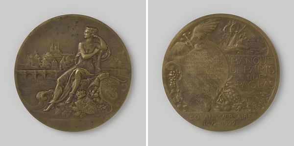 This bronze medal, "Hoop op vrede" or "Hope for Peace," was made in 1907 by Hippolyte Le Roy. Look at how the figures emerge from the metal, their forms defined by subtle shifts in relief, a real conversation between depth and surface. I like how the texture gives the impression that the figures aren't just imposed on the surface of the medal, but rather are integral to its very substance. On one side, a female figure extends her hand towards a seated male figure who is kneeling. It's like the artist is suggesting the possibility of peace and reconciliation emerging from the depths of conflict or despair, as the figures are both distinct and intertwined. The medal reminds me a bit of Rodin, also working in France around the same time, grappling with form and emotion. Both artists were interested in ambiguity. The ship at sea on the other side could represent the voyage we must take to find inner peace.