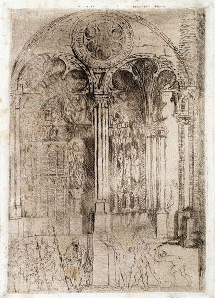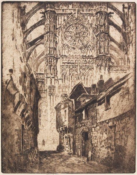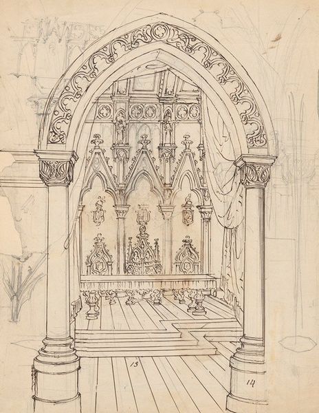 Curator: This is John Ruskin's "Study of Portal and Carved Pinnacles, Cathedral of St. Lô, Normandy." The artwork now resides at the Harvard Art Museums, inviting close study. Editor: My first impression? It feels like a dream fading at the edges, the stark lines battling against the soft, washed-out areas. Curator: Ruskin masterfully uses line and wash to emphasize the Gothic architecture. Notice how the strong vertical lines of the pinnacles contrast with the complex ornamentation surrounding the portal. Editor: Those pinnacles are fascinating, aren't they? They seem to reach for something beyond, laden with Christian symbolism, perhaps alluding to the ascent of the soul. Curator: Precisely, and Ruskin's handling of light and shadow creates depth and volume. The strategic use of negative space also enhances the overall composition, doesn't it? Editor: Yes, it does, the drawing captures the cathedral's grandeur and also hints at a deeper spiritual yearning, the kind embedded in our collective cultural memory. Curator: A brilliant distillation of form and feeling. Editor: Indeed, Ruskin makes us see not only the architectural elements but also the enduring power of faith translated into stone.