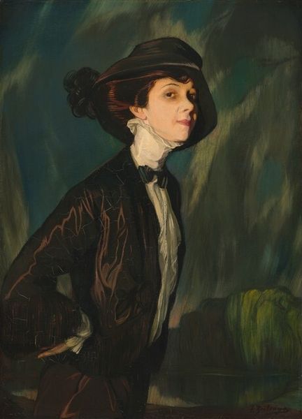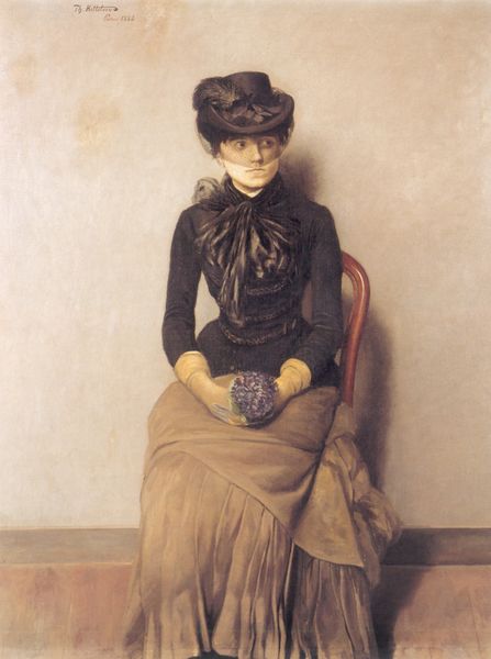 Editor: Here we have Caillebotte’s "Portrait of a Young Woman in an Interior" from 1877. It’s quite subdued, almost melancholic, with this muted color palette. What stands out to you about the visual symbolism at play here? Curator: Well, observe how Caillebotte uses the domestic interior. The young woman isn't just *in* a room; she's positioned within a framework of societal expectations, wouldn't you agree? Consider the potted plant. Does it suggest growth, confinement, or perhaps a cultivated beauty mirroring the woman herself? Editor: I hadn't thought of it like that! The plant's placement seems almost deliberate, a commentary. But what about her attire? The dark clothing, the elaborate hat… what do those communicate? Curator: Exactly! These visual signifiers, chosen by Caillebotte, construct a particular narrative. Black was, and still is, complex. While suggestive of mourning it's also, paradoxically, chic. The hat becomes a potent symbol of bourgeois identity and perhaps constraints placed upon women in that era. What do *you* feel when you observe it? Editor: I see a blend of constraint and perhaps a quiet defiance. The woman isn’t overtly smiling, but there's a self-assuredness in her gaze. It challenges the viewer. Curator: Precisely! Consider too the framed picture in the background. It provides context for the room that shapes her portrait, further grounding her narrative. Editor: I appreciate that shift in perspective – looking at how the image interacts with its symbols to paint a full portrait. Thank you for the insight. Curator: It has been a rewarding discussion of Caillebotte’s language of symbols and insight into fin-de-siècle sensibilities.
