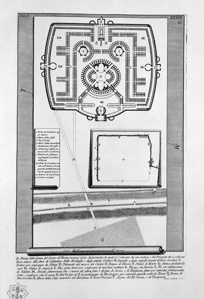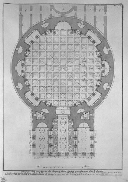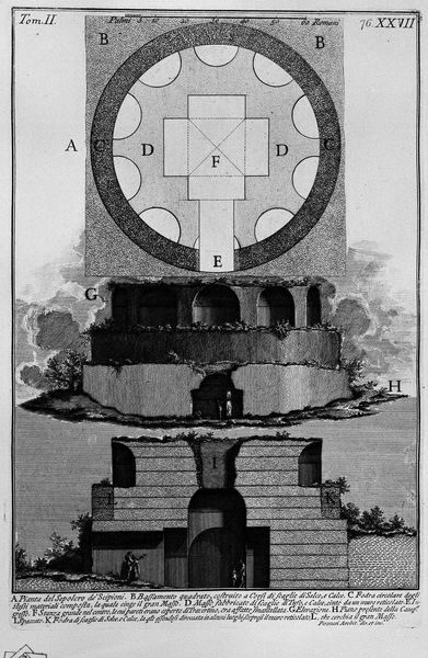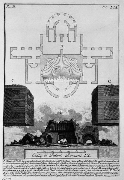 Curator: Looking at Piranesi's "Plan and elevation of the castle ruins stripped of any building addition," the stark, geometrical forms immediately jump out at me. It evokes a kind of melancholic grandeur. Editor: Indeed, Piranesi, known for his etchings, created more than just a record here. The image provides a bird’s eye view and frontal elevation, seemingly concerned with how architecture tells a story across time. Its lack of building additions and geometric framework highlights something deeper about power and loss. Curator: Precisely! I see those exposed foundations and decaying structures as more than just a historical record. The artist is interested in presenting the *idea* of ruins, hinting at layers of collective memory collapsing into the present. He exposes how these decaying forms connect us to the distant past. Editor: The etching technique itself enhances this effect. Note how the lines, although meticulous, retain a degree of ruggedness. I am thinking this echoes the relentless process of decay but simultaneously immortalizes it through art. This romantic ruin exists as both documentation and a reflection on socio-political upheavals over time. Curator: Do you notice how the meticulous layout underscores a tension between the rational order the Romans strived for, now surrendered to entropy? I perceive in these precise measurements an attempt to recapture that order. Editor: And the symbols scattered throughout this etched piece – they draw the eye, almost as if to decipher what was or will never be fully recoverable. Curator: Ultimately, Piranesi doesn’t just depict ruins; he reimagines our relationship with time itself. By removing those ‘building additions’, the raw presence is amplified and suggests timeless emotional weights connected to ideas and spaces, no? Editor: Well said. The stark representation encourages us to contemplate history's ongoing resonance. A conversation we, ourselves, are now part of within a museum setting, observing, documenting and reflecting.