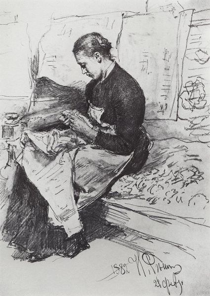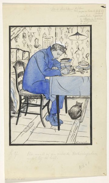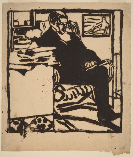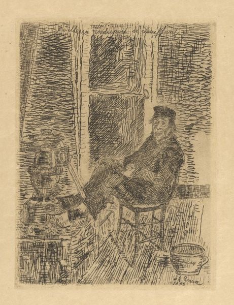 Curator: Let’s turn our attention to this “Untitled (Self-Portrait)" etching, dating back to 1935, by Theodore Wahl. What are your initial thoughts on this artwork? Editor: My first impression is of solitude, almost melancholic. The muted colors and the artist’s absorbed posture contribute to this feeling of quiet contemplation, hemmed in by that cityscape outside the window. Curator: Absolutely. Wahl, positioning himself in his studio with that city backdrop, invites us to consider the interplay between the artist's interior life and the external world of urban spaces during the interwar years. The gaze is directed downward. It makes me think about the burden that came with finding new footing in the changing sociopolitical environments of the early twentieth century. Editor: I agree. The choice of etching, with its fine lines and potential for detailed narrative, also feels significant. Printmaking was very politically powerful as well, opening artistic statements to a broader audience at the time. This work seems to deliberately explore not just his own identity but the role of the artist within the evolving cultural landscape, reaching as many people as possible in the process. He’s showing the realities of existing and working as an artist. Curator: Precisely. This etching isn't just a personal reflection; it's a statement on the artist's social and political positioning, exploring the act of creating and the gaze that results from art as political action. His narrative, as depicted through genre painting, reveals complex networks of personal history, societal pressures, and the will for self-expression. Editor: Looking at it from an art market perspective, the affordability of prints in the 1930s democratized art ownership. Wahl's choice of subject matter, showing his daily environment, speaks volumes about making art accessible. Curator: Yes, that accessibility is crucial for understanding the artwork's potential impact on its intended audience, especially with its potential to act as a form of resistance against oppressive systems. The etching process, therefore, amplifies the narrative's ability to instigate conversation and awareness around class, identity, and the struggle of self-representation. Editor: I find myself drawn to the city outside the window—its architectural forms almost mirroring the internal structure of Wahl's introspection. Thank you for expanding my view. Curator: It’s fascinating how artworks from this period continue to spark discussions relevant to our own. Thank you.
