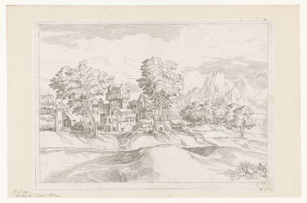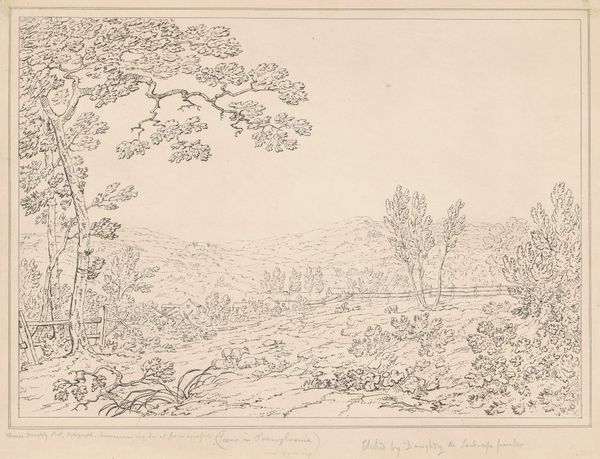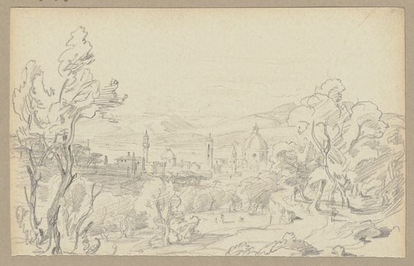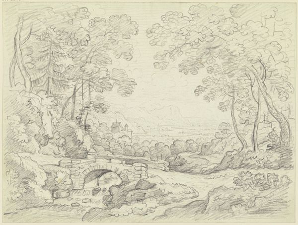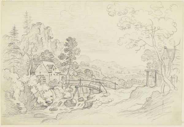 This landscape with a watermill was rendered in pencil by Friedrich Wilhelm Hirt. The artist employed a simple graphite pencil on paper, focusing on capturing the essence of the scene through line work and shading. The material's influence is evident in the delicate texture and varied tones achieved through layering and hatching. The softness of the graphite allows for a nuanced depiction of light and shadow, adding depth and atmosphere to the composition. We see the mill at the center, a crucial machine for grinding grain and thus, for feeding the community, its presence highlights the human impact on the natural world. Hirt engaged with the tradition of landscape drawing, capturing the sublime beauty of nature. Yet he also implicitly acknowledged the interplay between nature and human labor. By appreciating the materials, the making, and the context of this drawing, we can move beyond conventional art historical boundaries and gain a richer understanding of its social and cultural significance.