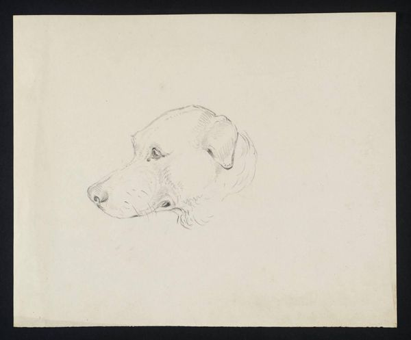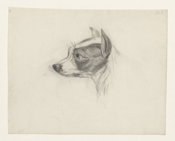 This is Johannes Tavenraat's 'Head of a Fox', a pencil drawing made sometime in the 19th century. The drawing presents us with a study in tonal variation achieved through the singular medium of graphite. Observe how Tavenraat uses closely hatched lines to construct the fox's form, creating darker values around the neck, giving way to lighter tones on its face. Note the acute attention to the animal's anatomy, particularly the rendering of the eyes and ears, which are depicted with sharp, decisive lines that capture their attentive alertness. The structural simplicity of the composition draws us into the nuanced expression of the fox, where formal elements intersect with a broader discourse on representation and perception. This seemingly straightforward drawing invites us to consider the role of the artist as an observer and interpreter of nature, mediating our understanding of the animal world through the careful arrangement of line and tone.