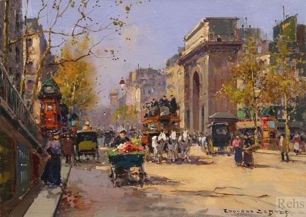 Curator: Edouard Cortes invites us into a bustling Parisian scene with his oil painting, "Café de la Paix, Paris." Editor: It evokes a grey, chilly day. Even though the painting hints at warm interior lights, a distinct mood of melancholic charm emanates from this city captured in muted tones. Curator: The composition is certainly divided into clear sections: we have a dense foreground of pedestrians, punctuated by a flower cart, which gives way to the impressive architecture of the Café and Opera in the midground, fading into an implied, expansive urban backdrop. It masterfully balances detail and suggestion, doesn’t it? Editor: Indeed. Beyond the literal, these carefully staged groups feel deliberately posed. The artist may use the flower vendor’s cart not merely as an element of the setting, but perhaps as a vanitas symbol, urging viewers to contemplate time passing amid the bustle of Paris. Curator: I am particularly fascinated by the rendering of light. Note how Cortes juxtaposes the diffused daylight against the sharp artificial lights emanating from the cafe; such chromatic differentiation guides the eye across the picture plane. Editor: Consider how Cortes presents Paris: rather than focusing on famous landmarks or heroic scenes, he presents daily life, thereby democratizing Parisian grandeur, making it more approachable to everyone. It is a powerful commentary on social inclusion. Curator: I appreciate your reading of its socio-historical context, whereas I was mainly focused on the interplay between form and colour, my reading focused instead on Cortes’ application of impressionistic painting. Editor: I like the push and pull Cortes' piece generates between form and symbolic weight. Thank you for bringing it to my attention. Curator: My pleasure; it’s intriguing to decode the artist's structured world.