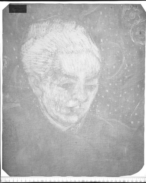 Curator: The work before us is an X-radiograph of “Self-Portrait with a Bandaged Ear and Pipe,” currently held at the Harvard Art Museums. Editor: The ghostly image, composed of layered greys, creates a palpable sense of unease. The textures appear so tactile, almost sculptural in their intensity. Curator: Indeed. This X-ray provides insight into the physical materiality of the artwork beneath the surface, hinting at the unseen labor and processes involved. Editor: I'm struck by how the composition seems to amplify Van Gogh's suffering; the bandaged ear becomes a focal point, a potent symbol of his fractured mental state. Curator: Perhaps, but the availability and cost of materials, the social conditions of image making, and even the accessibility of X-ray technology become equally important considerations for understanding the image. Editor: I concede that. Still, the raw emotionality conveyed through the stark contrasts is undeniable. Curator: A compelling reminder of the hidden stories embedded within every artifact, both physical and societal. Editor: And a rather unconventional way of looking at a familiar work.