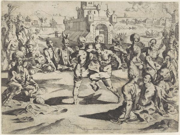 Curator: Jacob Matham created this engraving, titled “Parable of the Rich Man and Poor Lazarus,” in 1606. It's currently held in the Rijksmuseum. Editor: My immediate impression is chaos! But a very *structured* chaos. The opulence is practically bursting from the frame, even in the monochrome of the print. Curator: The image encapsulates the biblical parable. We witness the wealthy man feasting, oblivious, while Lazarus suffers immensely outside his gate. Matham presents a commentary on social stratification. Editor: Indeed, the layers of visual symbols tell a dense story. Consider the dog, a common symbol of fidelity, here licking Lazarus’ sores—an ironic twist. And isn’t that a peacock strutting around, a classic symbol of vanity, amidst the wealthy diners? Curator: Precisely. Matham uses these symbolic animals to underscore the moral message. He's responding to the patronage systems of his time and expressing some tension with wealth as it was being visibly flaunted. Editor: I see the composition mirrors this tension. The architectural setting moves our eye up the hill as the layers of humanity reveal their conditions of plenty and despair in equal measure. There is also tension in how all figures appear the same size regardless of their actual distance in the setting. Curator: The architecture provides a social framework for the story and displays current taste. Gardens like this one were places to display the political might of one’s family in the hopes of being granted access to more power and influence. These choices are directly implicated in who gets to be "good". Editor: It is the kind of symbolic staging that really stays with you. Look at the poor Lazarus right there with his faithful canine, emaciated... The picture holds two starkly contrasting sides within one view. Curator: What is especially impressive, as it appears here on display, is considering the context in which an artwork like this would have been consumed and what access to similar artworks may have been restricted. Editor: Reflecting on Matham’s engraving, the layers of symbolism truly capture the enduring relevance of the story. The moral commentary seems to become more pointed over time.