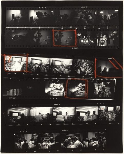 Editor: This is "Venice, Italy 28", a gelatin silver print from 1964 by Robert Frank. Seeing all the frames together like this, with different exposures and events, it feels almost like flipping through someone's memories. What strikes you most when you look at it? Curator: What grabs me immediately is the act of framing, both within the photographs themselves and in the larger presentation of the contact sheet. This isn't just about capturing an event, like a wedding perhaps, but about the decision-making process of what gets shown and how it gets shown. How does the display of the images change our understanding of the depicted ceremony? Editor: That's a good question. I hadn’t considered the politics of the selection itself. Are you saying Frank is showing us his power to decide what's important? Curator: It's not necessarily about power, but about pointing out the subjective nature of photography. By revealing the editing process, he challenges the supposed objectivity of documentary photography. We, as viewers, become aware of the mediation between the event and our perception of it. Do you think this presentation enhances or detracts from the emotional impact of the individual images? Editor: I think it enhances it because it adds a layer of reality. It is raw, like a sketchbook, where every shot isn't perfect, and choices are on display. This approach also seems more intimate and personal than a pristine finished product. Curator: Exactly. And that intimacy speaks to a larger shift in the post-war era, a desire to break down established norms and explore more subjective, personal narratives. It suggests also an emerging tension between public and private, a concept artists are always interrogating. Editor: So, understanding the context of the art world helps to understand the photo on a deeper level. This makes me wonder about the story behind it, like who are those individuals present there. Curator: Agreed, it could also make us more attentive viewers by prompting us to consider who controls how narratives are created.