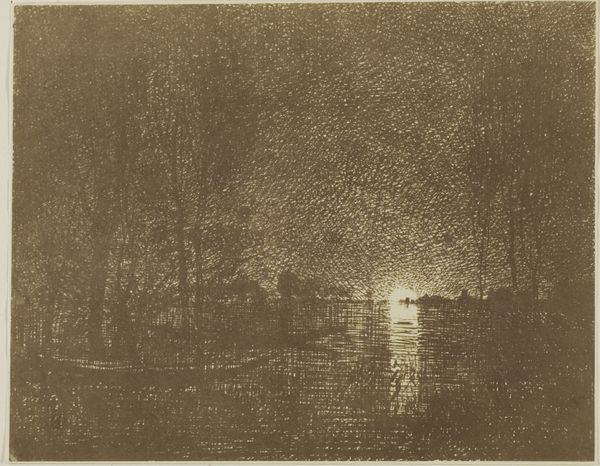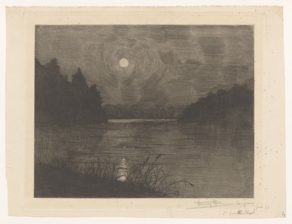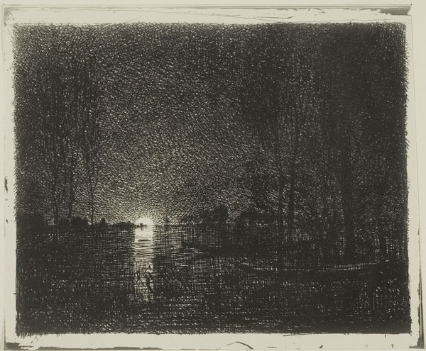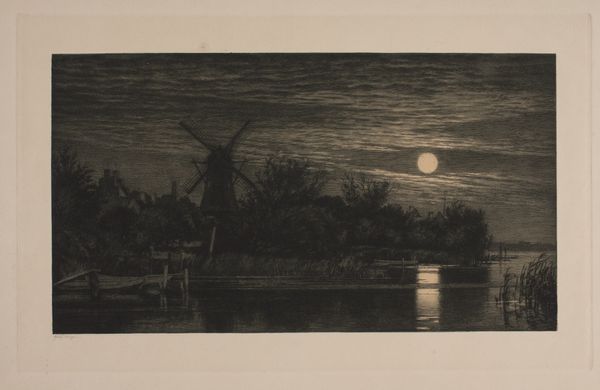 Henry Farrer created this intimate etching of Little Hell Gate, Harlem. Observe how Farrer masterfully uses the monochrome palette to evoke a contemplative mood. The composition is structured around a horizontal division, where the lower register, dominated by the reflective water, contrasts with the atmospheric density above. The dark sky, marked by striated clouds, meets the horizon, punctuated by the subtle glow of the moon. The artist's etching technique uses a complex network of lines, manipulating light and shadow to create depth. Note the intricate details of the shoreline vegetation, balanced by the more diffuse reflections in the water. Farrer plays with visual codes, where the subtle details of the sailboat and distant structures engage notions of space and perspective. The overall effect challenges fixed notions of landscape art, inviting a reflective assessment of the aesthetic and symbolic interplay between nature and representation.