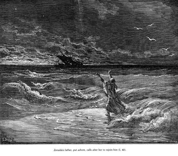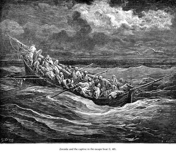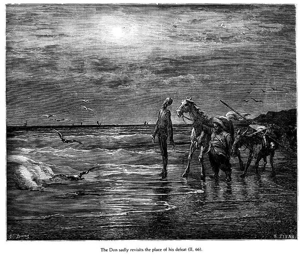 Gustave Dore made this engraving of Don Quixote. In this dramatic scene, we see the quixotic hero confronting not windmills but French corsairs, firing upon the captive's boat. This image reveals the 19th-century fascination with the romantic, yet violent, figure of the corsair, embodying themes of adventure and exoticism. In Dore’s time, images of piracy and maritime conflict were circulated in popular prints and books. What does it mean that Dore depicts Quixote tilting against piracy rather than more traditional enemies? The image carries the visual codes of romanticism: dramatic lighting, chaotic composition, and a sense of movement. The image romanticizes the violence of piracy, suggesting underlying colonial anxieties and power dynamics of the 19th century, particularly between France and other seafaring nations. To understand Dore's work fully, we can consult historical archives, literary criticisms of Cervantes' novel, and studies of 19th-century French cultural attitudes towards maritime adventures and piracy. This helps us understand the complex interplay between art, literature, and society.