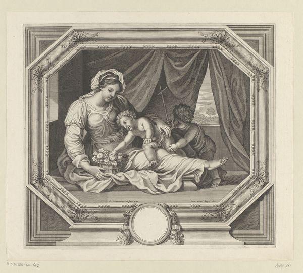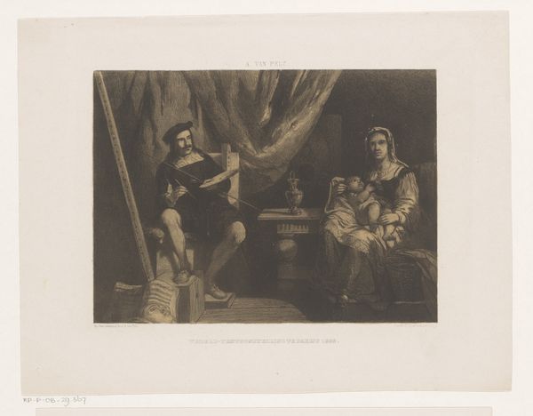 Editor: Here we have Adolph Kittendorff's "Saul og David," a lithograph from the 1880s. There's a striking stillness in this piece. The contrast between the burdened king and the youthful David creates such a potent atmosphere. What do you see in this image, especially concerning its symbolism? Curator: Immediately, I see the archetypal weight of leadership bearing down on Saul, visually represented through his pose and the somber light. Note how David’s harp acts not merely as an instrument, but as a vessel for emotional and psychological healing. Music is the symbolic language bridging their disparate states. Consider, what emotions were commonly linked to harp music during the late 19th century? Editor: Hope, maybe? Relief from suffering, certainly in this context. I suppose it's a bit like an early form of musical therapy, right? Curator: Precisely. The image speaks to a universal longing for solace, found even in the most fraught of power dynamics. Do you see how Kittendorff has arranged David in a submissive posture? His role isn’t merely entertainment, but also, one can interpret, a containment of destructive potential within the King himself. David as the youthful 'good' quelling a potentially tyrannic power. Editor: That's a powerful interpretation. So, it's not just about easing Saul's immediate suffering, but a symbolic check on his authority too? The music becomes almost like a binding force. Curator: Indeed. And note how such binding force isn't always benign. Think of the many myths, throughout cultures, where music is employed as a coercive element. What’s compelling here is to consider whether Saul welcomes such binding as an antidote, or if his brooding is resentment to his limited liberty. Editor: I hadn't thought about it that way at all! Now I see so many more layers in their interaction, beyond the surface narrative. Curator: Indeed. This image resonates because it’s a sophisticated meditation of influence. Kittendorff delivers to us the complex cultural memory behind it, and allows it to become continuously reimagined.