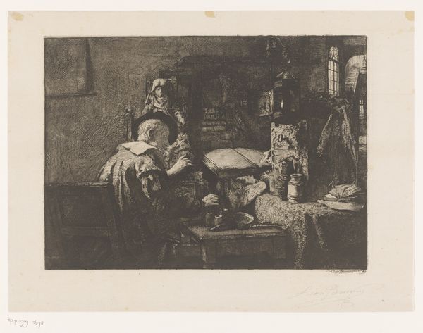 Polynice Auguste Viette created this detailed print, "Interieur met gezin," with etching. The composition invites us into a domestic scene rendered in a tight, enclosed space with close attention to detail through the meticulous etching. The arrangement of the figures—mother and child, father in armor, and supplicating daughter—creates a semiotic tableau. Viette's choice to depict the father in armor, an anachronistic element, disrupts the temporal logic of the scene. Note the contrast between the protective gear of the father and the softness of the mother holding her child, and the presence of a window suggesting both enclosure and an opening to the external world. This etching invites questions about the nature of protection, family roles, and the gaze of both the artist and the viewer within the domestic sphere. It offers a subtle commentary on societal structures and the performance of roles within the family unit.
