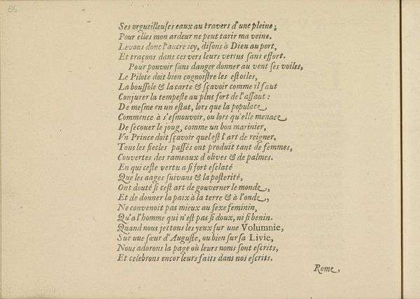 Editor: So, this is a page of typography, "Franstalig gedicht op de Nimfen van de Amstel, pagina 3" by Crispijn van de Passe II, dating to 1640. It's an engraving on paper and currently held at the Rijksmuseum. The poem is intriguing; it gives the sense of historical reflection and, perhaps, a longing for the past, given that antiquity is specifically mentioned. What historical insights can you offer based on your interpretation? Curator: Well, this engraving speaks volumes about the cultural climate of 17th-century Amsterdam. The presence of a French poem dedicated to the nymphs of the Amstel points towards a culturally diverse and sophisticated audience. Amsterdam was a hub of international trade and intellectual exchange. What political message is revealed in contrasting antiquity with its present time? Editor: Perhaps it suggests a critique of contemporary society? Or could the reference to Elizabeth of England signify more about Anglo-Dutch relations at the time? Curator: Precisely! And note how figures like Elizabeth and references to Rome itself act as powerful political symbols. These are deployed to construct a specific narrative of power and influence. We might ask ourselves, why frame Amsterdam through the lens of these foreign and historical contexts? Who is the poem *really* meant for, and what is its political agenda? Editor: That's fascinating. I hadn’t thought of it as constructing a particular view. I just saw the historical reference. It reframes my perspective completely, thinking about it being more directed than simply historical nostalgia. Curator: Yes. So this isn’t just about artistic or literary value; it’s about understanding the social and political role such imagery and texts played within the Dutch Golden Age, how such cultural products reinforce and negotiate existing power structures. Editor: So interesting! I now appreciate that even what appears as simply a poem can have significant cultural weight and political intent, it will impact my perspective in future study.