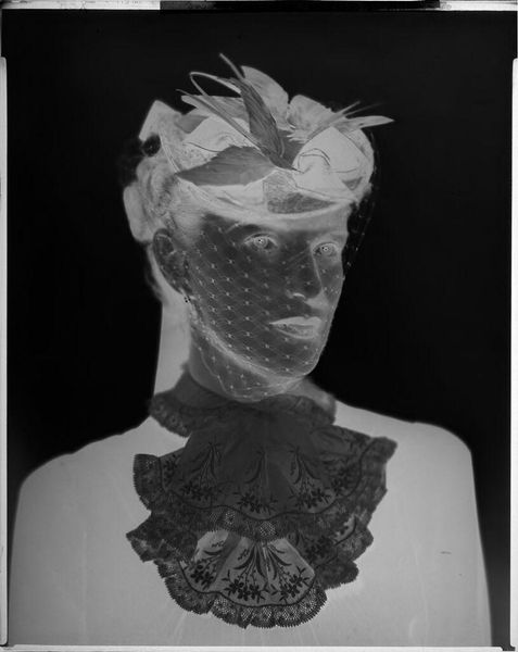 Curator: This is an untitled photograph, a striking work by Harris & Ewing currently held at the Harvard Art Museums. Editor: My initial reaction is one of subdued elegance. The high contrast emphasizes the textures, particularly the intricate veil and feathers. Curator: Harris & Ewing were a prominent Washington D.C. photography studio, capturing portraits of political figures and society members. This image offers a glimpse into early 20th-century portraiture conventions. Editor: Absolutely. The composition is so deliberate, with the subject’s gaze directed upwards, creating a sense of aspiration. The hat, carefully placed, acts as a focal point, framing her face. Curator: And the choice of attire speaks volumes about social status and the performative aspects of identity in that era. It really invites speculation about who this woman might have been. Editor: Agreed. The interplay of light and shadow enhances the almost theatrical quality. The negative space around the figure focuses us on the play of textures and form. Curator: Considering the historical context, this image can be understood as a carefully constructed representation, adhering to societal expectations of female beauty and decorum. Editor: Yes, and perhaps also revealing a desire for empowerment, cleverly concealed within those very conventions. Curator: Precisely. It's a compelling reminder of photography’s power to both reflect and shape our perceptions. Editor: Indeed, a testament to the enduring visual language of portraiture.