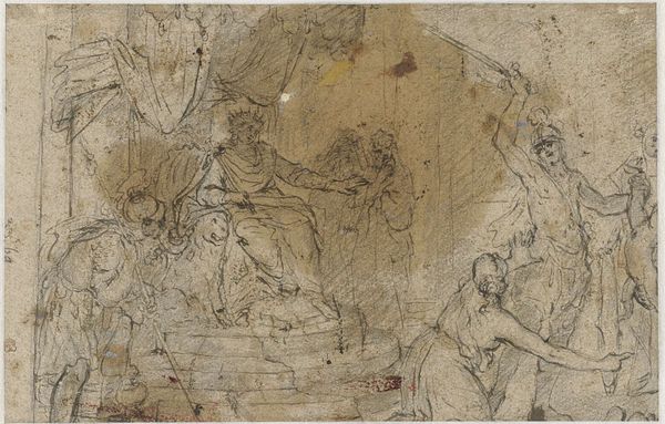 Curator: Welcome. Before us is Théodore Géricault's "Sketches of Men's Faces, Horses' Muzzles, and Mounted Soldiers," created between 1813 and 1814. It’s currently held at the Art Institute of Chicago. Editor: It feels like a fever dream. All these overlapping figures sketched so rapidly. I wonder about the hand that produced these marks—so quick, almost frantic. What paper and ink were available to him then? Curator: Well, during this period, Géricault was deeply engaged with military themes, aligning with the grand Romantic narratives that stirred the public imagination, particularly after the Napoleonic era. Editor: The means of visualizing power. I mean, just look at those equestrian figures! Are these graphite and ink? There’s an immediacy, as if these sketches were born directly from observation. Not the polished result, but the tangible moment of their creation, visible. Curator: Exactly. And Géricault wasn't just interested in glorifying war. He was investigating human and animal forms under the duress of conflict. How the turmoil shaped not just bodies, but spirits too. Editor: You know, when I consider his artistic practice, I'm thinking not only of the paper, but the availability of models or uniforms. The cost of the raw materials alone signals privilege, and a society deeply affected by what it consumes. Curator: A very sharp point. And while Romanticism glorified the individual, it did so by embedding the individual in history, particularly concerning social mobility at the time and the effect on the public. The mounted soldier wasn't simply a figure; he was a symbol of broader societal shifts and structures. Editor: The visual language of class then becomes really striking. The details he includes in some portraits but neglects in others suggests so much. It asks us to investigate how class is performed, not merely observed. Curator: Ultimately, I think Géricault captures something essential about an era of dramatic social and political change reflected and driven by art. It’s a raw study of men and horses enmeshed in forces bigger than themselves. Editor: Absolutely. The sketch's roughness is deceptive; it's deliberate and it really shows how even the quickest strokes of line on paper hold echoes of the social reality.