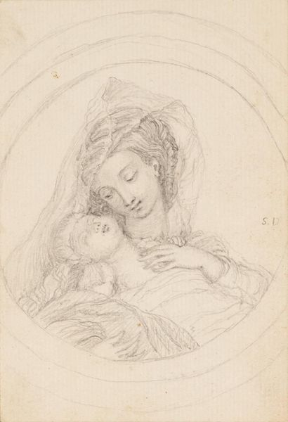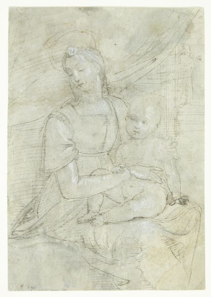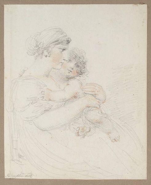 Curator: Here we have "Eine Mutter, ihr Kind umarmend" which translates to "A Mother Embracing her Child" a tender sketch currently held at the Städel Museum. Though undated, this work on paper is attributed to Marie Ellenrieder. Editor: Ah, the ephemeral nature of pencil on paper, capturing a moment so universally felt! There's something almost ghost-like about it, the lines so delicate. You feel you could blow it away. Curator: Indeed. Ellenrieder, a German artist associated with the Nazarene movement, often explored themes of motherhood and childhood in her work. We see it recurring across a lot of her painting and illustrations too, always seeking a sort of pure idealism. Editor: It’s fascinating that while Ellenrieder's name isn't as recognizable as some of her male contemporaries, her delicate treatment transforms something ordinary into something almost holy, a moment suspended between reality and some imagined, heavenly version. Curator: Precisely! The lack of strong, definitive lines— the kind associated with say academic drawing of the era--suggests a more personal, intimate purpose, like a sketch from a personal sketchbook, more concerned with feeling than accurate record keeping. Editor: Which adds to that feeling of immediacy, doesn't it? As if we’re peering into Ellenrieder’s own quiet, tender contemplation of motherhood. It has that wonderful tentative vulnerability like spying on someone's private, happiest daydream. Curator: And placing it in the context of 19th century Europe, it reflects societal expectations around motherhood, but it doesn’t glorify it exactly. There isn't that hard idealised gleam in it we may associate with popular portrayals. Editor: Which actually makes the relationship between them more palpable, more humane! Instead of seeing figures staged for perfection, we sense true affection, intimacy. It invites you into this warm sphere of love. Curator: A fleeting emotion given tangible shape—however lightly—and a compelling piece offering insight into both Ellenrieder's artistic practice, as well as a sense of the 19th century cultural ideas. Editor: Well put! It certainly makes one consider the unseen labor and artistic merit that sketches such as these carry...like little whispered secrets we were lucky enough to overhear.