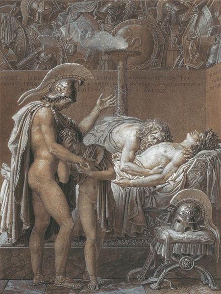 Curator: So, "The Sleeping Venus" by Paul Delvaux, painted in 1944. It’s certainly a striking composition. Editor: It is! It's unsettling, almost dreamlike. You've got this nude Venus figure, seemingly asleep, surrounded by these architectural forms, figures, and… is that a skeleton? How do you interpret this work in its historical context? Curator: Good question. It’s important to remember this was painted during World War II. Considering Delvaux’s involvement with the Surrealists and their concerns with the subconscious, how might we see this piece as a response to the anxiety and uncertainty of that era? The nude Venus – a symbol of beauty and sensuality – is juxtaposed with the image of death. This speaks volumes about the precarity of life. Editor: So, the skeleton isn’t just a morbid detail, but a symbol of the moment, maybe even a protest of sorts? Curator: Precisely! The architecture, so precise and yet so deserted, it gives us that surrealist touch, suggesting the collapse of order and reason that characterized the war. Do you notice the figure to the left, adorned with a big hat? What do you make of that figure’s presence? Editor: She feels like an observer, disconnected from the central figure, perhaps pointing towards the skeleton? A witness to a loss of innocence, maybe? Curator: Interesting! Loss, precarity, the body under threat... Perhaps these elements serve to politicize what might appear at first glance to be a more standard, erotic depiction. Editor: That really shifts my perspective! It’s easy to get caught up in the surreal aesthetic and miss the deeper social commentary. Curator: Absolutely. Delvaux compels us to engage with how societal traumas manifest within the seemingly personal realms of desire and beauty. Editor: I'll definitely look at surrealism differently from now on, considering its capacity for political statements.