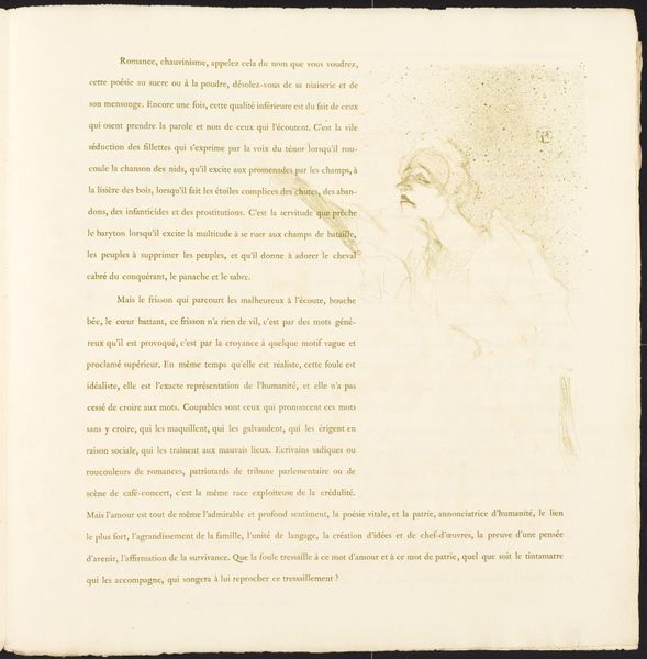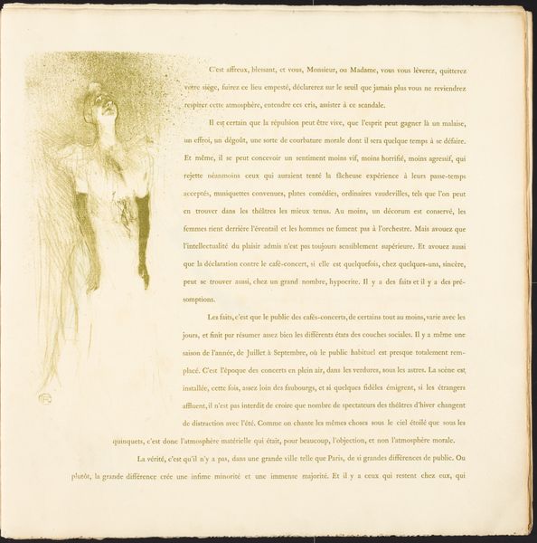 Curator: Henri de Toulouse-Lautrec created this compelling image, a lithograph titled "Yvette Guilbert" in 1894. It captures the singer Yvette Guilbert. What strikes you first about it? Editor: Immediately, it’s the starkness. The fluid lines of ink seem to dance across the paper, yet there’s also this pervading sense of melancholy. It feels so fleeting and intimate at once. Curator: I find the simplicity of the medium itself very telling. Lautrec’s choice to use lithography underscores the broader movement of art moving into the public sphere. He designed images that were made for mass reproduction through prints, rejecting earlier traditions that valued only single expensive oil paintings. Editor: Absolutely. This makes me think about who Guilbert was—not just some anonymous model, but a public figure who occupied her own unique place in fin-de-siècle Parisian culture. Her popularity, largely with the working classes, made her both celebrated and scandalized in equal measure. So how does that inform this work? Curator: It suggests Lautrec was perhaps engaging in his own form of celebrity culture. The popularity of Parisian cabaret performers inspired commissions, the lithographs then publicized their performances through advertisement, while also pushing what it meant to create artwork at that moment in history. Editor: Exactly, the image feels so intertwined with notions of performance and visibility, yet simultaneously, he is portraying something incredibly real. There's a sense of honesty, even vulnerability in the way she's presented here. Lautrec isn't simply aestheticizing her for consumption; he’s acknowledging her as an individual. I wonder if it attempts to capture something of the artist's lived reality, working in Montmartre and fraternizing with those the stuffier elements of French society had written off. Curator: I would say that framing this work through ideas around authenticity is a little problematic, but I see what you mean. Considering Lautrec's context does change how we interact with the image, however. His unique vision offers something beyond what another artist from the same era could convey, given his experiences of social exclusion through disability. Editor: It's true, isn't it, that our encounters with art, and our critical response, are shaped by our identities. What this exploration has cemented for me is the way art captures a specific moment in time, filtered through individual perception but equally shaped by broader sociopolitical forces. Curator: Precisely. Understanding those dynamics is crucial to deciphering what these images mean, what work they perform in culture, and also the history behind how art acquires cultural significance.