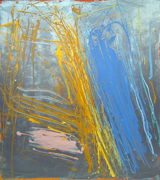 Editor: This is "Looking Out, Breaking Out" painted by Jeremy Henderson in 2004, made with acrylic paint. I'm really drawn to the shades of blue – it almost feels like you're underwater, looking up at the sky through the surface. What do you see in this piece, from a formalist perspective? Curator: Thank you. Immediately striking is the emphasis on flatness, a deliberate denial of traditional perspective. The spatial depth is compressed, achieved not through linear perspective but through overlapping planes of colour. Notice the almost aggressive brushstrokes. They don't describe so much as *construct* the image. How does the artist manipulate the medium to convey, say, texture or mood, beyond just representation? Editor: Well, the strokes seem pretty chaotic. Does that randomness add meaning? Or is it the artist letting the paint speak for itself? Curator: It's controlled chaos. Observe the composition: the trees, while identifiable, are essentially vertical arrangements of colour and form. Note how the light isn't naturalistic; instead, it serves to flatten the space further, pushing the painting towards abstraction. What’s your analysis of the semiotic interplay of 'looking out' and 'breaking out' as visual concepts represented via compositional devices? Editor: The 'breaking out' part...maybe the broken brushstrokes are trying to show it, with some colors jumping outside the main picture? Curator: Indeed. And also that tension between representation and abstraction. It suggests an impulse toward freedom, an escape from the confines of traditional representation. This piece masterfully plays with pictorial space while denying its conventional function, isn’t it? Editor: Definitely! Seeing the brushstrokes and color interactions as meaningful parts and not just background changes my understanding of abstract painting a lot! Curator: Indeed. By attending to the raw materials and how they interact, we are that much closer to appreciating what the artist’s goal might have been.