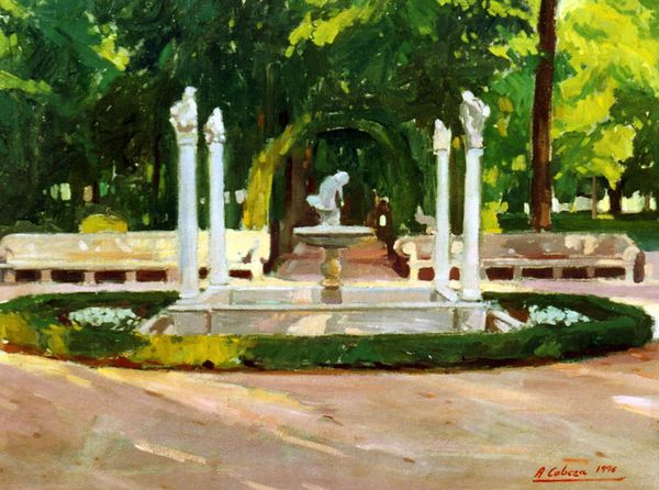 Editor: We’re looking at John Singer Sargent’s "Marble Fountain in Italy," circa 1907, a watercolor painting. It strikes me as both solid and fleeting, capturing the monumentality of the fountain while still conveying a sense of ephemeral light. How do you interpret this work? Curator: Water sustains and symbolizes purity, cleansing. Here, held in marble, what could this mean in the collective cultural memory? Notice how Sargent contrasts the weighty fountain with the delicate touch of watercolor, almost like a dream held within the tangible world. Editor: So, is he playing with the idea of permanence versus transience? Curator: Exactly! Consider the Italian garden setting – historically, spaces of cultivated leisure and display of wealth. Fountains were potent symbols of power and control over nature, almost like alchemy to generate precious metal from something as common as tap water. But, what do you think the clear blue background contributes? Editor: Well, blue often represents serenity or peace. It kind of removes you from time…almost an endless quality. Curator: Precisely! So the bright blue juxtaposes the artifice of the garden fountain and suggests boundless nature. Sargent asks: what does human endeavor create within nature? Editor: That tension really makes the piece come alive! I hadn’t thought about the cultural significance of gardens and fountains that way. Thanks! Curator: My pleasure. Symbolism and historical context can provide endless readings to enrich our experience.