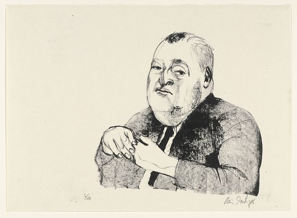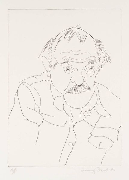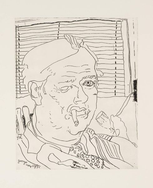Editor: So, this is Barry Flanagan's line drawing of George Melly, housed at the Tate. The simple lines give it such an intimate feel. What can you tell me about how this piece fits into the art world at the time? Curator: Well, portraits are always about power dynamics, aren't they? Who is seen, and how are they seen? Flanagan, known for his sculptures, chooses a very direct, unvarnished approach here. It's interesting considering Melly's own position as a public figure critiquing culture. Does this portrayal reinforce or challenge his public persona, do you think? Editor: That's a good point. I hadn't thought about it in terms of power. I guess it feels more like an honest encounter. Curator: Perhaps, but honesty is constructed, isn't it? By both artist and sitter, and the institutions that validate it. Editor: I see what you mean. It's definitely more complex than it first appears. Curator: Precisely! Thinking about it as a cultural artifact lets us see the many layers of meaning within such a seemingly simple work.