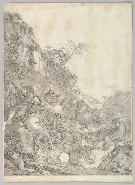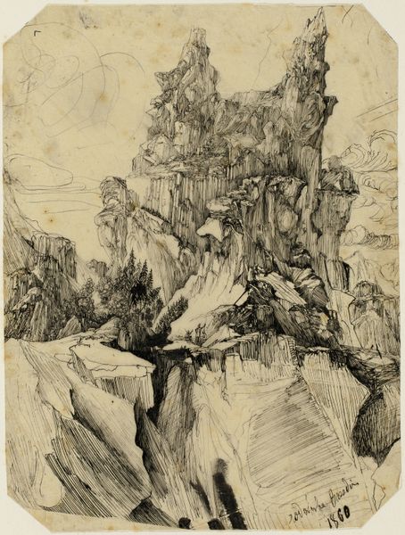 Curator: Immediately striking is the raw energy of this ink drawing; a craggy, almost primordial landscape unfolds before us. Editor: You’ve eloquently captured my first impression, its energy feels somewhat unsettling. A landscape depicted with a nervous hand, would you agree? Curator: It’s a controlled nervous energy, if that makes sense. This is "The Strange Pines of Mount Tiantai," created in 1687 by Dai Benxiao, and currently residing here at The Metropolitan Museum of Art. Benxiao was known for pushing the boundaries of traditional ink techniques. Editor: The "strange pines," I see! Twisted, almost like watchful sentinels guarding this sacred mountain. There are two figures too, solitary, contemplative almost like hermits. Does this location have particular significance? Curator: Absolutely. Mount Tiantai has deep roots in Chinese Buddhism and Daoism; it’s considered a place of enlightenment. Benxiao wasn’t simply painting a picturesque scene. In using dramatic composition with abstract angular forms, I feel like he emphasizes Mount Tiantai to suggest an intimidating journey. Editor: Yes, precisely! There’s also a fascinating duality, a push-pull between the spiritual aspiration of mountain ascetics with this sense of earthly discomfort. That contrast feels powerful. How did this experimentation affect Benxiao’s position within artistic circles? Curator: In many ways it elevated his position! Benxiao refused to serve in the Qing court, but aligned himself as a Nanking loyalist. Creating work like this one—allowed his art to become an instrument of personal and political resistance, and aligned himself with those intellectual artistic circles. His highly expressive and individualistic style became celebrated for capturing something profoundly genuine about the artist’s state of mind and resistance. Editor: And now it reverberates through the centuries. You see both a historical record and an active psychological narrative expressed through mountains and strange pine trees. It is powerful how symbolic imagery maintains itself in unexpected ways across time. Curator: It does remind us that we all respond to the landscapes we're forced to inhabit. Editor: A beautiful meditation for any age.