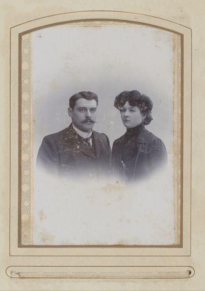 Editor: This albumen print, "Portret van een vrouw en een man," was created sometime between 1890 and 1910. There’s a certain stillness, almost solemnity, to the piece. The fading quality of the photograph, and the deliberate posing really bring forth the gravity in a way, I suppose. How do you see the role of materials and process here? Curator: Well, consider the albumen print itself. This wasn't simply snapping a picture. Egg whites, meticulously coated, sensitized, exposed, printed. Think of the labor involved in producing just this single image. The very materiality of the photograph speaks to a different era of production and consumption. Editor: So it's less about the sitters and more about how the photograph came to be? Curator: Not exclusively, but we can understand their representation through the lens – literally – of the production methods of the time. How did this photographic process shape the portrayal of the sitters? Who had access to such technology and how did it define class? How are gender and identity constructed through the available materials? Editor: That's interesting. It does change how I view their expressions and composure, thinking of them against the backdrop of photographic techniques during the industrial era. It makes them a commodity and subjects in some social process too, not just "a couple" captured in the amber of history. Curator: Precisely. By examining the material and social conditions of its creation, the photograph becomes more than just a portrait; it becomes a document of its time, reflecting the interplay between technology, labor, and social standing. Editor: I now understand that "craft" such as photography can be analyzed similarly to art to glean into an entirely new understanding of the artwork as cultural object and product. Thanks!