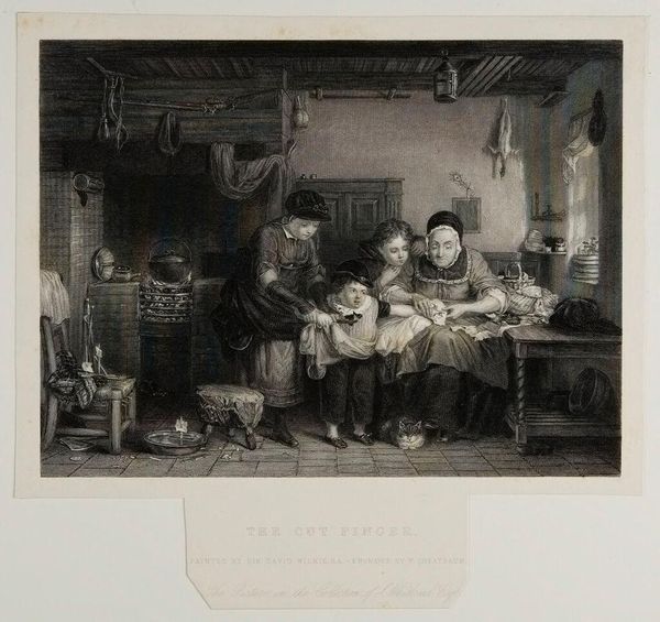 Curator: Thomas Major's "The Country Surgeon" presents us with a fascinating tableau. Look at how the composition divides the space, creating distinct zones of activity. Editor: It’s chaotic, isn’t it? Like a stage play where everyone's forgotten their lines. The light seems to struggle to find its focus. Curator: Precisely. Note the intricate cross-hatching, the delicate rendering of textures. Major orchestrates a complex interplay of light and shadow. Editor: It makes me think about the realities of healthcare back then, not romantic at all! You have that rat hanging and the poor bloke with his foot up. Curator: Consider the semiotic implications. The rat, perhaps, symbolizes the unsanitary conditions. The surgeon embodies a certain… ambivalence. Editor: Definitely a lot to chew on. Makes you appreciate modern medicine, and maybe the subtle humor woven in? Curator: Indeed, a work dense with visual and social commentary. Editor: I hadn't expected to be so intrigued; it's more dynamic than first glance suggests.