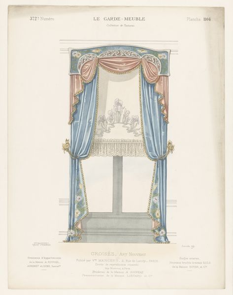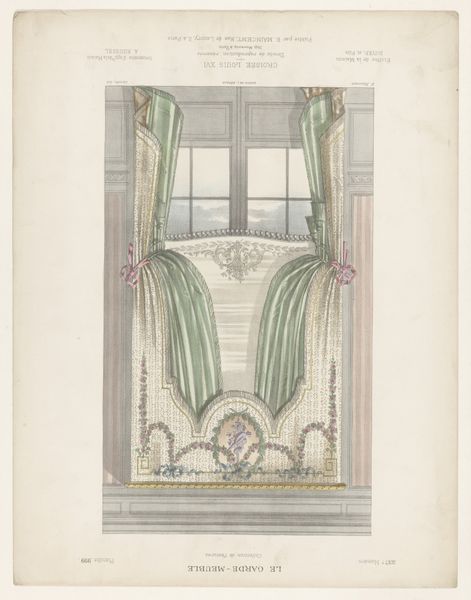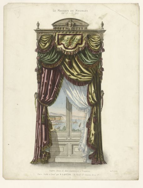 Editor: This watercolor and print drawing titled "Venster met gordijnen," or "Window with Curtains," dates from around 1885 to 1895 and is by Léon Laroche. The piece presents an interior view of an armchair looking out to a seascape through decorative curtains. I find it interesting how much emphasis is given to interior decor, which feels very theatrical. What's your interpretation of this work? Curator: The focus on interior decor during this period, particularly within the context of Romanticism, often spoke volumes about social aspirations and cultural identity. These draperies and the armchair, while seemingly benign, were markers of class and taste. Given that this piece includes fishing equipment as part of the design, I wonder about its relationship to maritime history, and perhaps even colonial narratives of resource extraction? What statement might the artist be making by incorporating fishing gear into this lavish setting? Editor: That’s a thought-provoking perspective. I hadn’t considered the fishing gear as potentially alluding to broader socio-economic and power structures, rather I was simply thinking about it in relation to maritime leisure. Curator: The 'leisure' aspect itself is key here. Whose leisure is being represented, and at what cost? This piece gives us insight into the culture of the decorative arts and can be re-examined as a visualization of that era's values. Do you think there are any visible connections to social class beyond just “taste?” Editor: Thinking about it now, I see how the over-the-top theatrical display speaks to privilege. Thanks for sharing your expertise. Curator: Of course. Recontextualizing pieces allows them to open to many views. I now wonder about the identity of the inhabitant as displayed in this design and what can be said about their values based on the choices displayed.