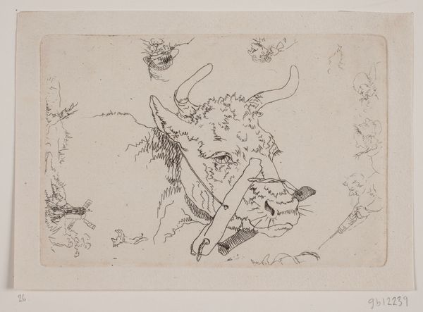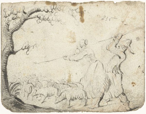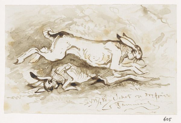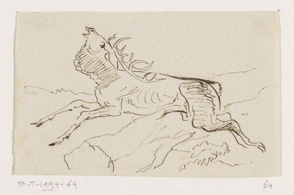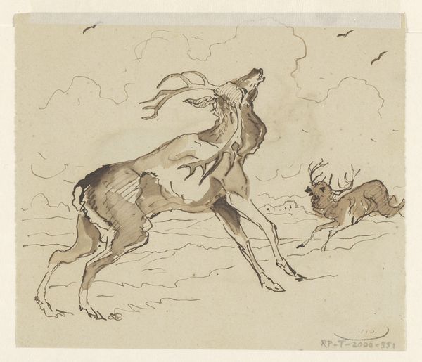 Johannes Tavenraat created this drawing, "Twee herten," around 1868, using pen and brown ink on paper. Tavenraat lived during a time of significant social and economic change in the Netherlands, witnessing the transition from an agrarian society to a more industrialized one. His choice to depict animals, specifically deer, speaks to a romantic idealization of nature, perhaps as a refuge from the rapid modernization he saw unfolding. There’s a tension in how deer are viewed, often seen as symbols of grace and freedom, yet also as game, hunted for sport and sustenance. How might this duality reflect the artist's own relationship with the changing world around him? The sketch-like quality of the drawing, with its quick, almost frenetic lines, conveys a sense of urgency or movement. It also invites us to consider the ephemerality of the natural world. This piece evokes a feeling of fleeting beauty, and perhaps a quiet commentary on the transience of life itself.