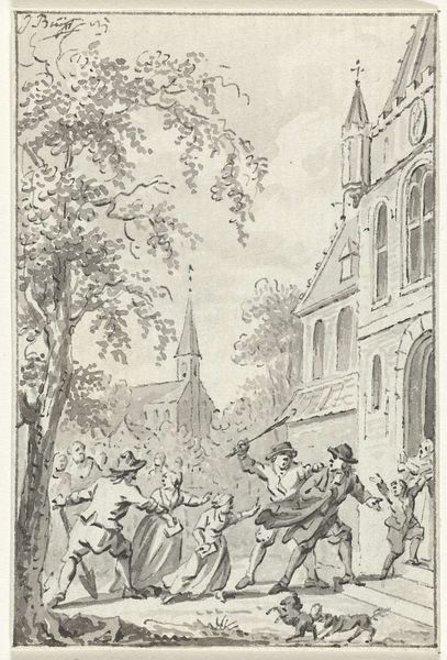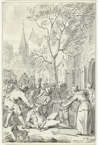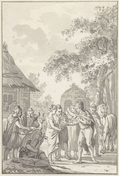 This drawing, made around 1730 by Jacobus Buys, depicts Jacoba van Beieren shooting at a bird target in Goes, using pen and gray ink, brush in gray and brown, and graphite. The texture of the drawing is crucial, as the controlled but varied pen strokes convey the texture of garments, faces, and natural forms such as the surrounding trees. The work is a drawing, not painting, so we're looking at marks that result from action: the hand of the artist moving across the surface, making decisions about when and where to apply pressure, creating lines that define and articulate form. Buys was very attuned to the cultural significance of textiles, fashion and clothing as material expression and identity. This drawing is not just about recording an event; it's about how material culture can represent power, status, and cultural values. By taking a closer look at the materiality and making of the image, we can understand its deeper social and cultural significance.