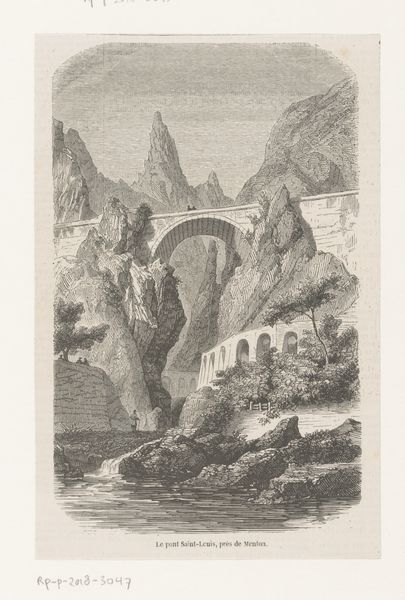 Curator: Carl Morgenstern's watercolor drawing, "View of the Via Mala on the Splügen Pass Road," created in 1856, offers a striking vision of nature’s grandeur intertwined with human engineering. Editor: My breath literally caught. There’s something so…imposing. The cliffs seem to swallow you whole, and that little bridge? Makes you feel incredibly small. Like an ant! Curator: The composition certainly plays on that feeling of the sublime. Via Mala, known for its dramatic, steep gorges, becomes a stage where nature asserts its dominance, yet the bridge represents humanity’s ambition to conquer it. Consider the Romantic period, from which Morgenstern emerges: how might this placement reflect prevailing views on industrialism's advance upon untouched landscapes? Editor: Conquer, or… dance? Maybe it’s a negotiation. Like, “Okay, mighty cliffs, we appreciate your majestic presence, so we'll just tiptoe through, leaving as small a footprint as possible." Curator: That interpretation has merit. Notice the subdued palette. Browns and grays dominate, suggesting the raw, unyielding character of the rock. What does that imply about accessibility in 1856? Editor: Yeah, there is not a ton of colorful exuberance here, is there? It's definitely got that muted 19th-century vibe. But those subtle watercolor washes... gives the stone this almost velvety quality, right? A kind of tenderness amid the harshness, which feels very... him. It makes me wonder what it felt like to traverse those spaces at the time. Before modern roadwork and when you had to move a slower pace... It is an architecture of the way... Curator: Morgenstern's delicate brushstrokes in rendering architectural detail and his manipulation of scale underscore the contrast between organic forms and constructed elements. Do you sense how themes related to power and the environment also highlight gendered dimensions during the Romantic era? After all, woman/nature... man/industry has deep sociohistorical roots. Editor: Definitely a dialogue happening there, maybe even an argument! What stands out most is not what we think it is, but how these imposing edifices and precarious perches impact what moves on either side or through their midst. And, wow, just imagining standing on that little bridge... the dizzying heights... pretty awesome. It’s made me think about what will eventually take over any human attempt to harness the world around us… Curator: Indeed, and reflecting on Morgenstern's Via Mala brings renewed urgency to such issues that persist.