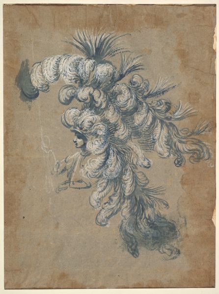 Baccio del Bianco rendered this design for a lavish headdress with feathers on a helmet with pen and brown ink, heightened with white gouache on gray paper. The headdress, a swirling vortex of feathers, sits atop a helmet, signaling power, status, and perhaps a touch of the theatrical. Consider how feathered headdresses have been donned across cultures, from ancient Egyptian royalty to indigenous American war bonnets, each iteration imbuing the wearer with a certain aura of authority and connection to something beyond the mundane. The feathers, symbols of flight and freedom, become instruments of psychological elevation, transforming the wearer into a figure of awe. Over time, this symbol has resurfaced, evolved, and taken on new meanings in different historical contexts. Bianco's design reflects not merely fashion, but the cyclical progression of power and identity expressed through symbolic adornment.