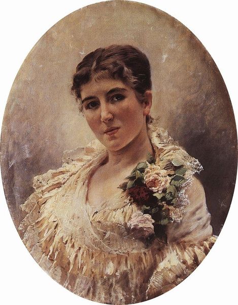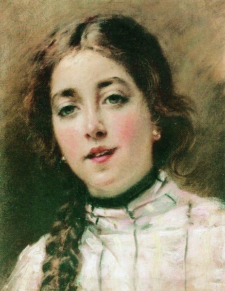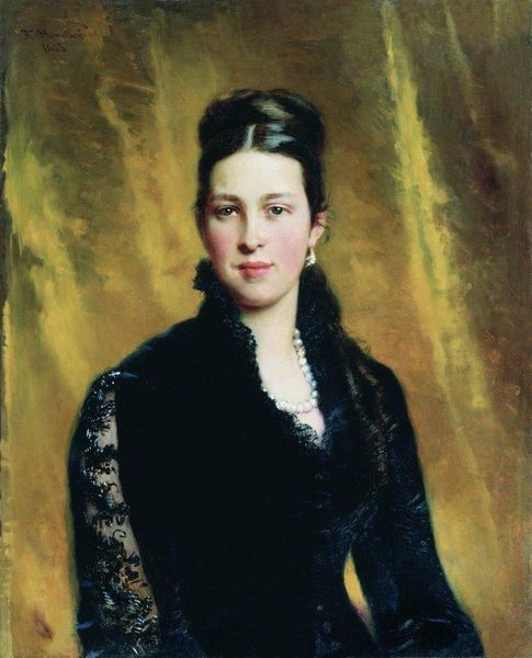 Editor: Here we have Konstantin Makovsky's "Female Portrait," painted in 1880. There’s a certain… seriousness to it, wouldn’t you say? I mean, she’s striking, but the colours and her expression make me wonder what she’s thinking. What do you see in this painting? Curator: Seriousness, perhaps, but also a hint of mischief! Notice the glint in her eyes – a little secret she's holding back. The deep reds and browns absolutely sing to me – so characteristic of Romanticism, playing with shadow and light to build depth, like gazing into a mysterious dream. And her pearls, nestled against the lace... They feel a bit fragile. Do you pick that up? Editor: A little, but I was also thinking about how posed she looks. The lace and pearls read as status symbols, I think. Curator: Absolutely! These portraits were carefully constructed declarations, meant to showcase not just the subject, but her place in society. Yet, Makovsky has managed to imbue her with a life that steps outside rigid formality. Imagine who she truly was...what stories are layered in the shadow that surrounds her. I feel an urgency, and tenderness in his brushstrokes. Don't you? Editor: That's true. I initially saw her as stiff, but knowing that gives the portrait another dimension, for sure. Curator: Exactly. And that's where the joy in looking at art resides! There's a whole other story to uncover beneath the surface of representation, if you just pause and contemplate. Editor: Definitely a lot to consider! Thanks, I see so much more now.