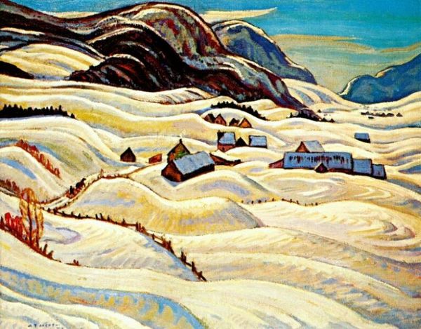 Curator: This oil painting before us, created by A.Y. Jackson in 1933, is entitled "Winter Morning, Charlevoix County." What are your initial impressions? Editor: Immediately, I’m struck by how much the light insists itself upon this scene, bathing the snow in what seems like a sunset hue. It feels almost like a theatrical set, very consciously composed, doesn't it? Curator: It’s interesting that you note the light first. Jackson, while working within the Group of Seven and their vision of a distinct Canadian landscape, always acknowledged his roots in European Impressionism, and the Fauvist color palette adopted here creates a dramatic mood. However, I find that such formal analysis neglects to analyze the role landscapes play in the narrative of colonization of indigenous territories. Editor: That's a salient point. How does that perspective inform your view of this particular canvas? The barrenness of it certainly invites thoughts of harsh environments, perhaps reinforcing ideas of the North as empty land. Curator: Absolutely. Think about what isn't represented here – the absence of Indigenous presence, even though Jackson painted prolifically in Indigenous territories. That silence resonates with the historical erasure and cultural genocide that these communities endured through Canadian policies. Jackson’s gaze itself becomes a tool of power, shaping a particular vision that can reinforce dominant ideologies. Editor: So you're suggesting we need to question whose landscape this is and what narratives it subtly perpetuates. While ostensibly a scene of natural beauty, we should be more sensitive to whose stories and struggles are intentionally left unseen in favor of portraying romantic notions. Curator: Precisely. Jackson's choices in subject matter, style, and composition construct a certain version of reality. By being conscious of the politics of representation, we engage in more equitable conversations about art history and its lasting effects on Canadian national identity. Editor: Thanks for making me look at the artwork through such an intersectional lens. It has greatly enriched my understanding of it! Curator: You're welcome. I'm grateful for your interpretation. The constant interplay between historical context and contemporary theory is essential when we view and discuss these types of artwork.