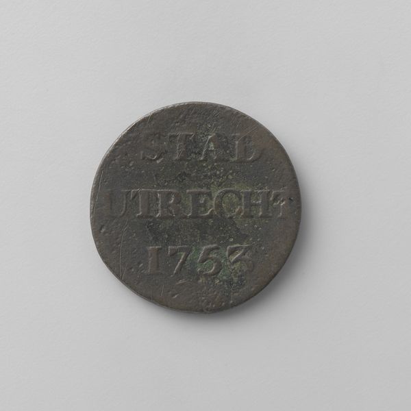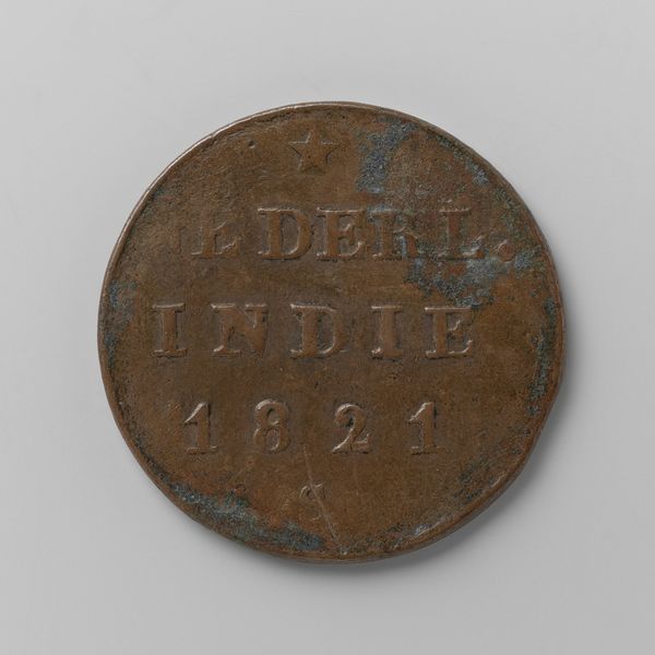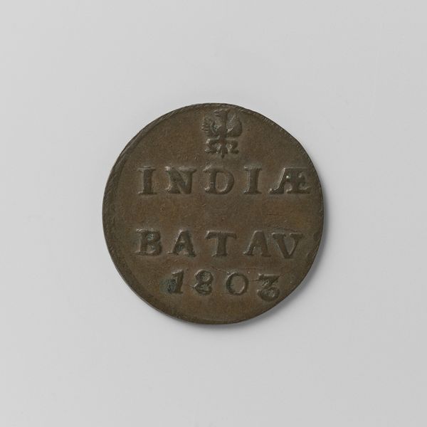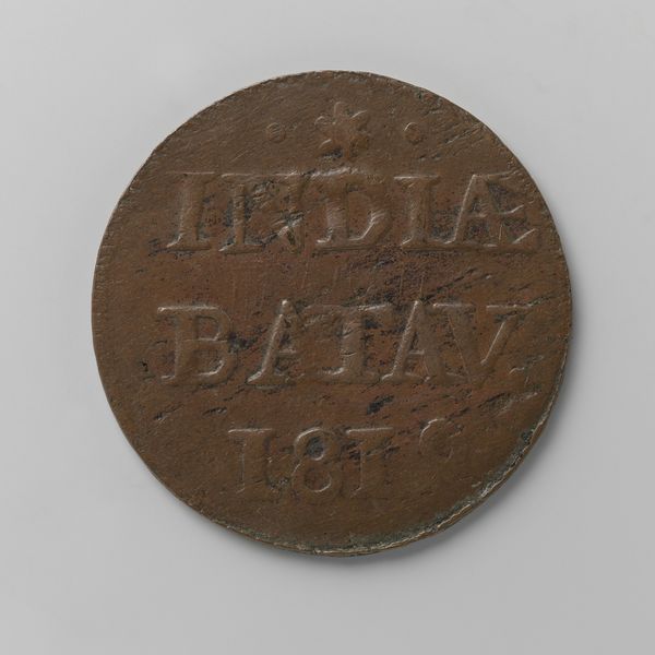 Editor: This is a bronze coin from 1818, a ½ Duit from the Dutch East Indies, currently held in the Rijksmuseum. The inscription is quite clear despite the coin’s age. How might we analyze this purely from its visual qualities? Curator: Indeed. Notice how the circular format immediately dictates the organization of the inscription. The words "INDIA BATAV." and the date, "1818," are stacked, creating a sense of balance. What do you observe about the texture and form of the lettering itself? Editor: The lettering looks deeply impressed. It creates a relief effect. Is that significant in numismatic art? Curator: Absolutely. The depth and clarity of the engraving contribute to the legibility and longevity of the inscription, crucial for a coin in circulation. The choice of bronze, too, its color and material presence, speaks to its functional durability. The circle itself is of significance. What does the geometry suggest? Editor: That's interesting! I see the perfect circle containing history, economics, and power... and that a larger context influenced these design choices! Curator: Precisely. It encapsulates a world of meaning within its form, which goes to show the symbiosis of pure design, function, and meaning! Editor: I learned about the inherent design in everyday functional art and that geometric choices are seldom random. Curator: And I see the power of such objects lies not only in functionality, but in their physical representation of cultural and political history.