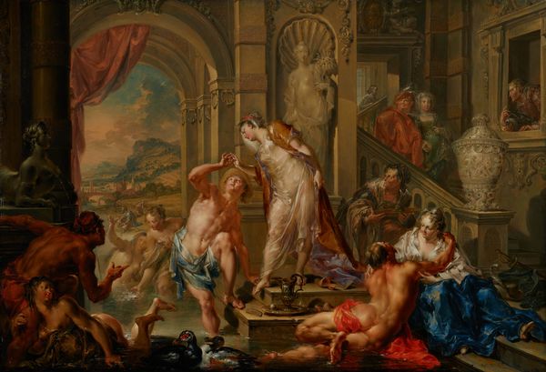 Jan Verkolje painted "Herse Preparing to Receive Mercury" using oil on canvas. The composition is striking; light is focused on Herse, centrally positioned, creating a visual hierarchy. The theatrical use of red drapery above and the figures arranged around her evoke a sense of drama and anticipation. Verkolje's treatment of light and shadow—chiaroscuro—adds depth and volume, highlighting the sensuality of the scene. The semiotic elements in the painting, such as the discarded arrows of Cupid, suggest a shift from innocent love to divine eroticism. The architectural setting, with its classical columns, points to themes of power and fate, framing Herse's acceptance of Mercury as an inescapable destiny. The contrast between the earthly and divine is further emphasized by the texture; the smoothness of Herse's skin against the rougher textures of the fabrics and stone. This contrast enhances the symbolic weight of the scene, underscoring themes of transformation and the interplay between mortal and immortal realms.