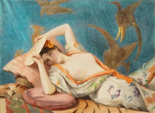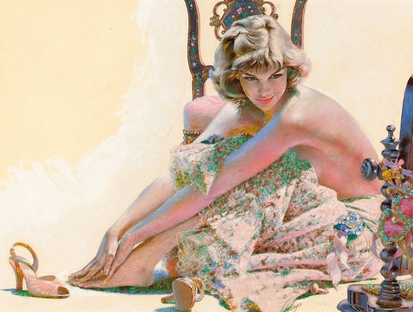 Editor: This photograph by Gordon Parks, called "Barbra Streisand," seems to be from after 1964. The contrast between Streisand in her sparkling gown and the charcoal drawing behind her is really striking. What do you see in this piece? Curator: The overlay is fascinating. Parks positions Streisand amidst allusions to historical art. Notice how her pose seems consciously crafted against the backdrop. Doesn't the charcoal drawing recall classical themes – a bacchanal or nymphs at play? The layering speaks volumes. Editor: Definitely! It’s almost like he’s placing her within a specific art-historical lineage, right? But what's the significance of putting her against that particular backdrop? Curator: Parks, known for his documentary work and capturing the Black experience in America, also had a keen sense of symbolism. The choice is interesting considering Streisand's emerging stardom, a figure stepping into a realm traditionally dominated by certain conventions. It plays with ideas of beauty, celebrity, and representation. Are we looking at the construction of an icon? Editor: So, by contrasting her glamour with these classical nudes, Parks is making a statement about how female images are perceived and how celebrity impacts that? Curator: Precisely! He prompts us to consider how society views female beauty across time. Parks infuses historical symbols with a contemporary twist, inviting viewers to contemplate how our understanding of imagery and celebrity evolves. What was your reading of her pose and gaze? Editor: Her slightly averted gaze gives her a sense of both allure and self-possession, almost like she's aware of the artistic references around her. Curator: I agree. The power of this portrait lies in its complex interplay of symbols, inviting ongoing interpretations and sparking dialogue on identity. Editor: Absolutely. The way Parks weaves together classic and contemporary imagery to frame Streisand is pretty thought-provoking. Curator: It enriches our understanding of not only Streisand as a subject but also Parks as a multifaceted visual narrator.