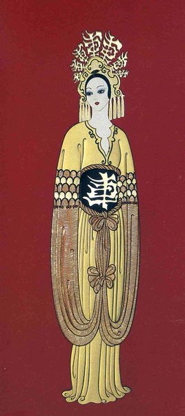 Curator: Nicholas Roerich's "Yaroslavna," painted in 1913, offers a striking figuration in the Russian Avant-Garde style, don't you think? Editor: Absolutely. The first thing that grabs me is the intricate patterning and the sheer density of the textures, almost overwhelming the figure. The material presence is quite pronounced. Curator: The patterns create complex repetitions and variations that draw the eye, moving it across the canvas. Notice how the artist uses concentric circles and contrasting hues of red, yellow and blue to activate a visual rhythm. Editor: Right, and considering the date, I immediately start thinking about textile production in Russia at the time, the local artisanal traditions influencing the work, and perhaps Roerich consciously elevating "craft" traditions. Was this a piece designed as a costume, do we know? Curator: Indeed, Roerich's interest in stage design makes that likely, the stylized form pointing toward a theatrical purpose. The figure embodies a kind of tragic majesty, conveyed through the restrained pose and subtle use of color symbolism. Editor: So it is form meeting function and feeding back into a particular cultural identity or historical narrative. Are there any visible traces of how this was painted or any indication of the watercolor medium’s limitations? I am interested in seeing what it looks like to work with these fine materials. Curator: The visible strokes create a layering effect that adds depth to the costume's rendering. Despite the work's surface-level ornamental beauty, the sitter’s sad expression offers a stark contrast, making it more than a superficial rendering. This is an intentional composition of form to emote meaning and presence. Editor: Precisely, this is an opportunity for understanding how labor and production intersect with artistic value, rather than isolating beauty from function. Ultimately, examining materials tells its own silent story. Curator: A compelling piece both formally and culturally, revealing visual patterns of narrative that linger in one’s mind. Editor: Roerich definitely prompts us to consider these rich points of intersection of labor and the narrative it supports.